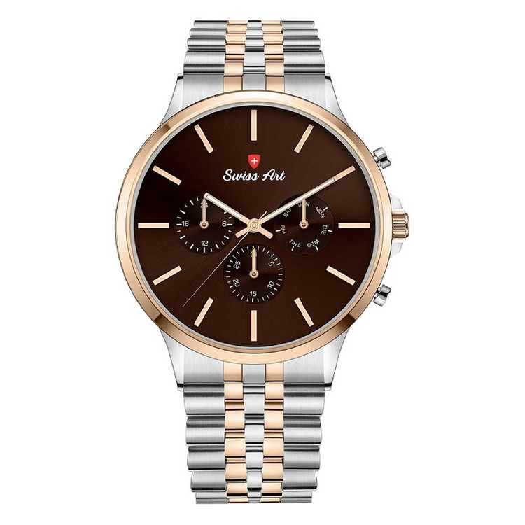 این مدل از ساعت سوئیس آرت با قاب گرد و بند فلزی طراحی شده است. برای جذابیت بخشیدن به شکل ظاهری ساعت از طراحی های به روز استفاده شده است . این ست ساعت سوئیس آرت داری تک موتور میباشد و دارای تقویم روز شمار میباشد. جنس بدنه این ست از ساعت سوئیس آرت استیل بوده و به سادگی تغییر رنگ نمیدهد و از دوام بالایی برخوردار است. در ساخت شیشه آن از سافایر استفاده گردیده که نسبت به سایر شیشه های موجود در بازار از مقاومت بیشتری در برابر خش برخوردارند.