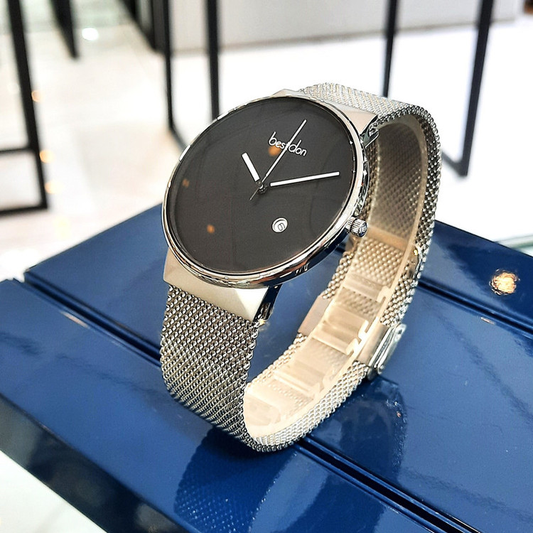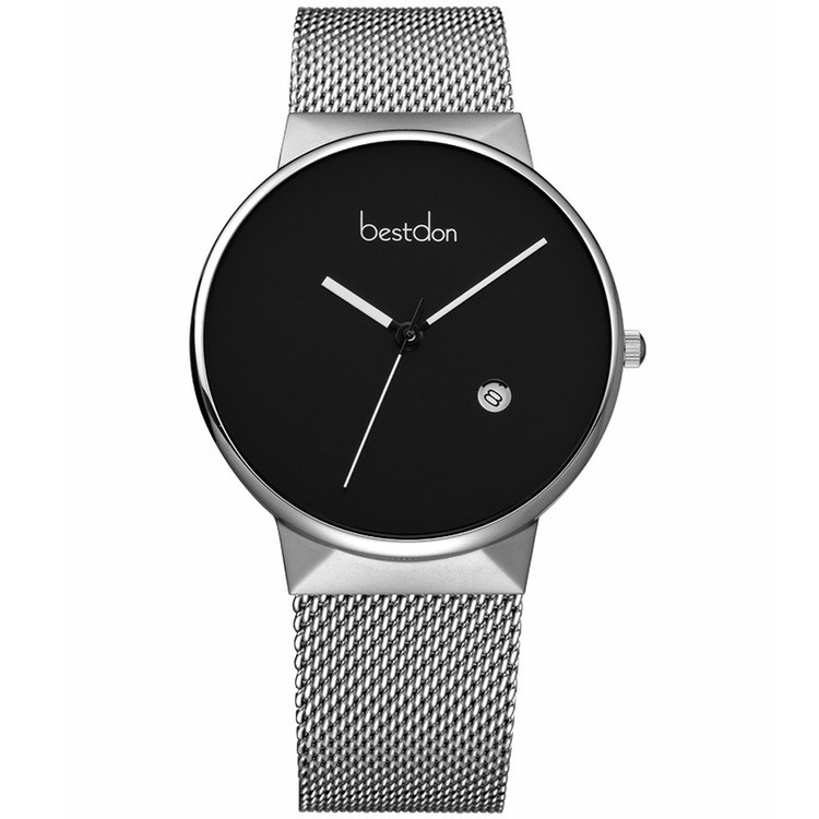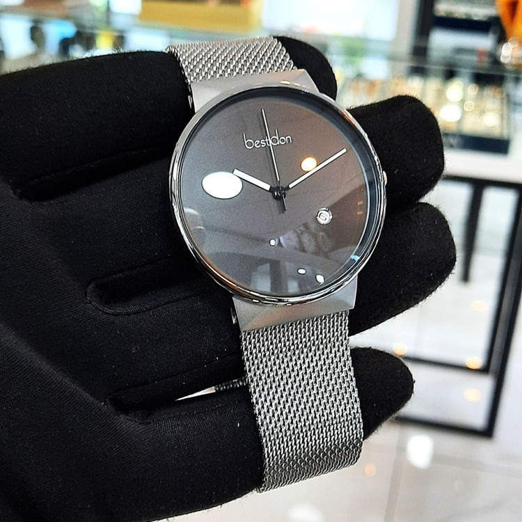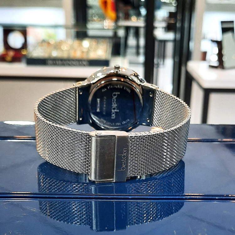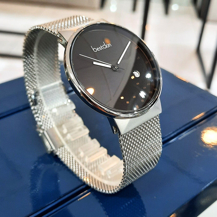ین ساعت مچی از برند بستدون مردانه بوده و جنس بند و بدنه ی آن استیل آنتی آلرژی و ضد حساسیت میباشد که از رنگهای نقره ای و مشکی در آن استفاده شده است. سادگی در ساعتهای بستدون کاملا مشهود است و به شکلی زیبا از این سادگی در ساعتهای بستدون استفاده شده که چشم هر بیننده ای را به خود جلب میکنند. بند این ساعت بستدون به شکل حصیری بافته است. همچنین این ساعت دارای شیشه ی محدب و برجسته بوده که زیبایی آن را دو چندان میکند. این ساعت دارای نمایشگر روزهای ماه نیز است. همچنین این طرح از ساعت بستدون دارای ست زنانه است.