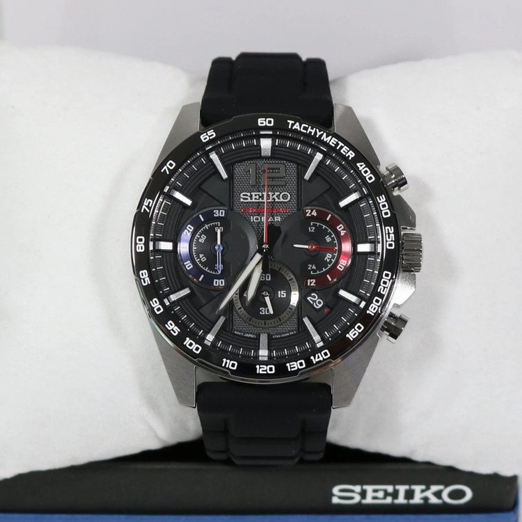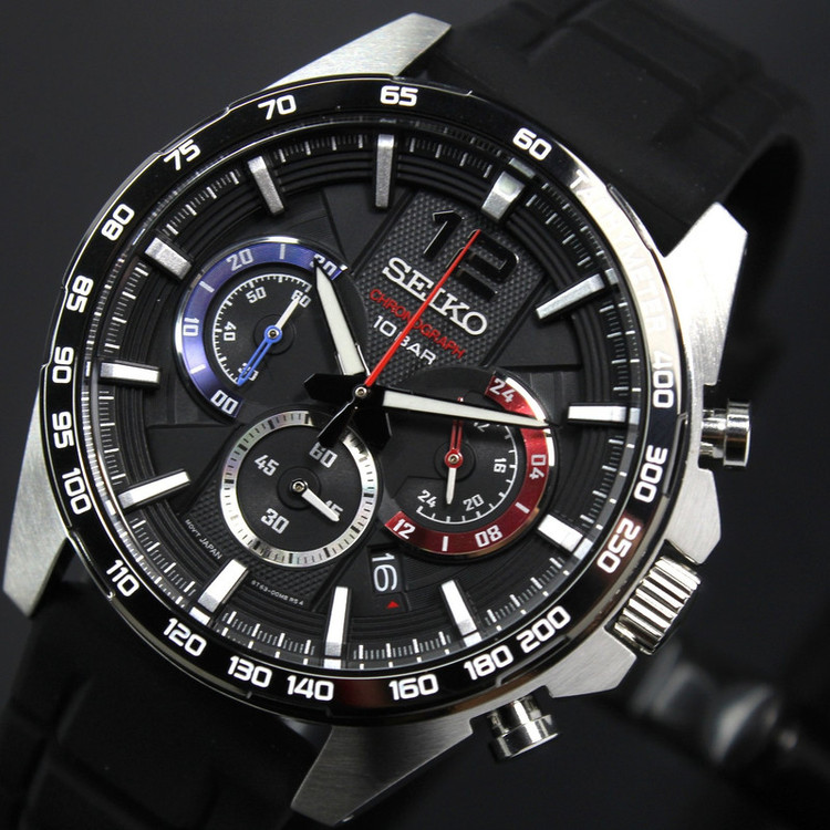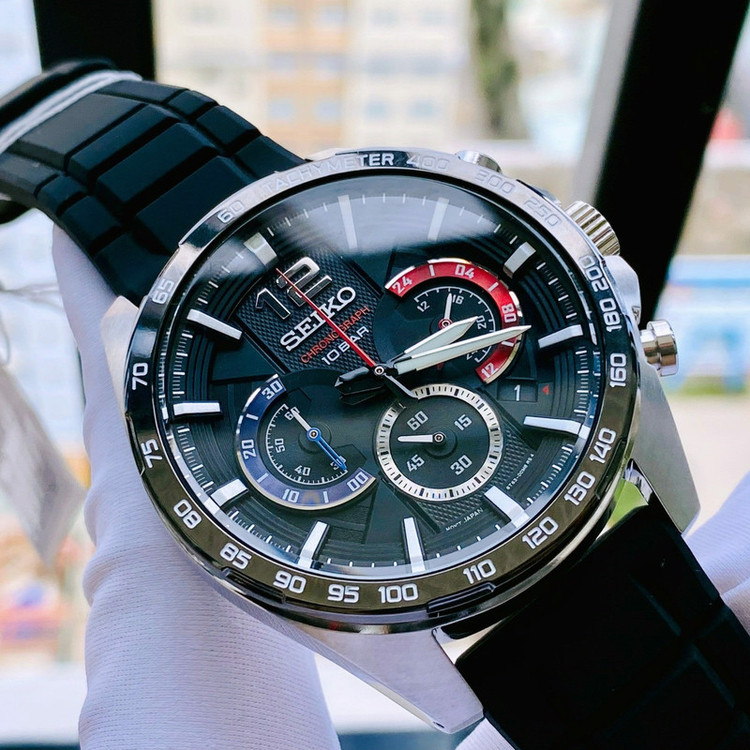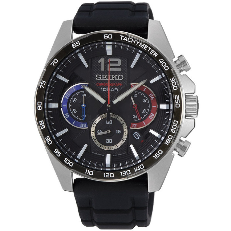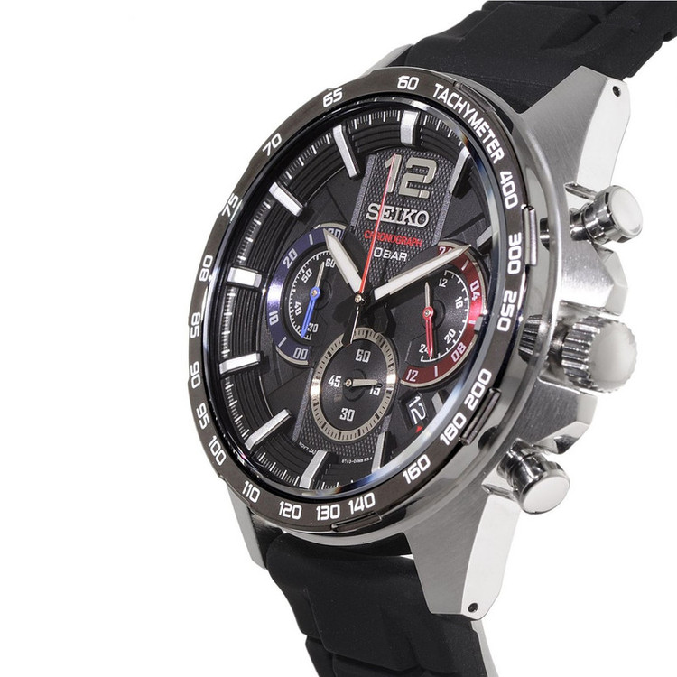 این طرح از برند ساعت سیکو با طراحی و رنگ خاص خود برای تیپهای نسبتا اسپرت بسیار مناسب میباشد. بند از جنس رابر و بدنه ی این ساعت سیکو از جنس استیل است که از ترکیب رنگهای مشکی و نقره ای در آن استفاده شده است. از ویژگیهای منحصر به فرد این ساعت میتوان به طراحی بسیار شیک و اسپرت ساعت در عین مجلسی بودنش اشاره کرد. این ساعت سیکو چند موتوره یا کرنوگراف بوده و عقربه های کوچک آن کرنومتر هستند و همچنین دارای نمایشگر روزهای ماه و وضعیت 24 ساعته نیز هست. اعداد دور صفحه این ساعت تاچمتر هستند که برای محاسبه و سنجش سرعت استفاده می شوند.