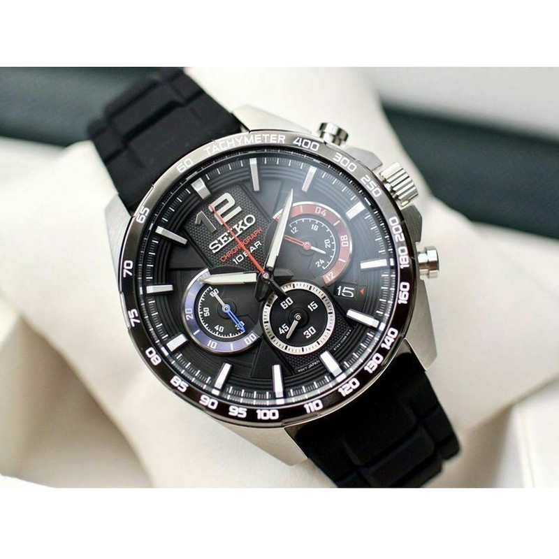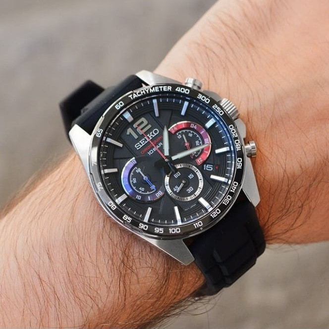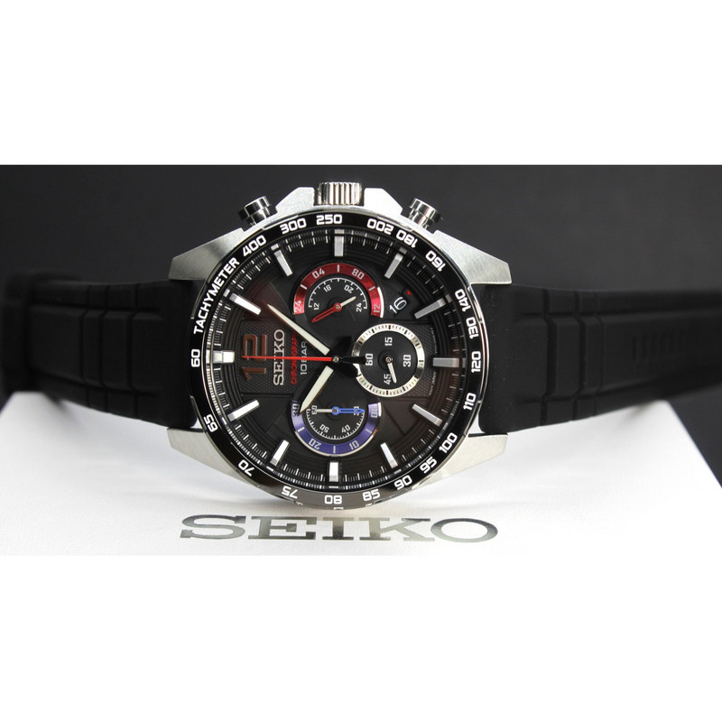 این طرح از برند ساعت سیکو با طراحی و رنگ خاص خود برای تیپهای نسبتا اسپرت بسیار مناسب میباشد. بند از جنس رابر و بدنه ی این ساعت سیکو از جنس استیل است که از ترکیب رنگهای مشکی و نقره ای در آن استفاده شده است. از ویژگیهای منحصر به فرد این ساعت میتوان به طراحی بسیار شیک و اسپرت ساعت در عین مجلسی بودنش اشاره کرد. این ساعت سیکو چند موتوره یا کرنوگراف بوده و عقربه های کوچک آن کرنومتر هستند و همچنین دارای نمایشگر روزهای ماه و وضعیت 24 ساعته نیز هست. اعداد دور صفحه این ساعت تاچمتر هستند که برای محاسبه و سنجش سرعت استفاده می شوند.