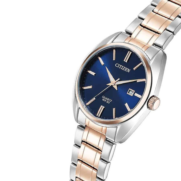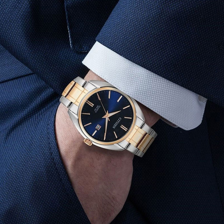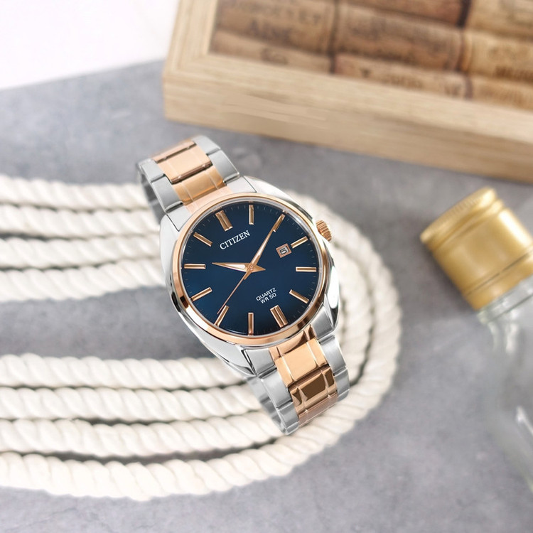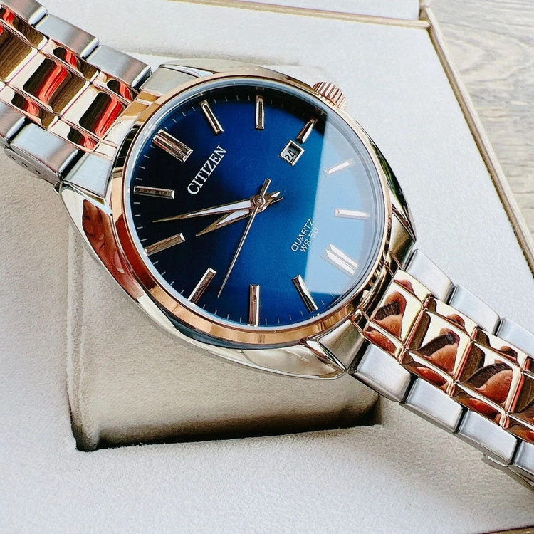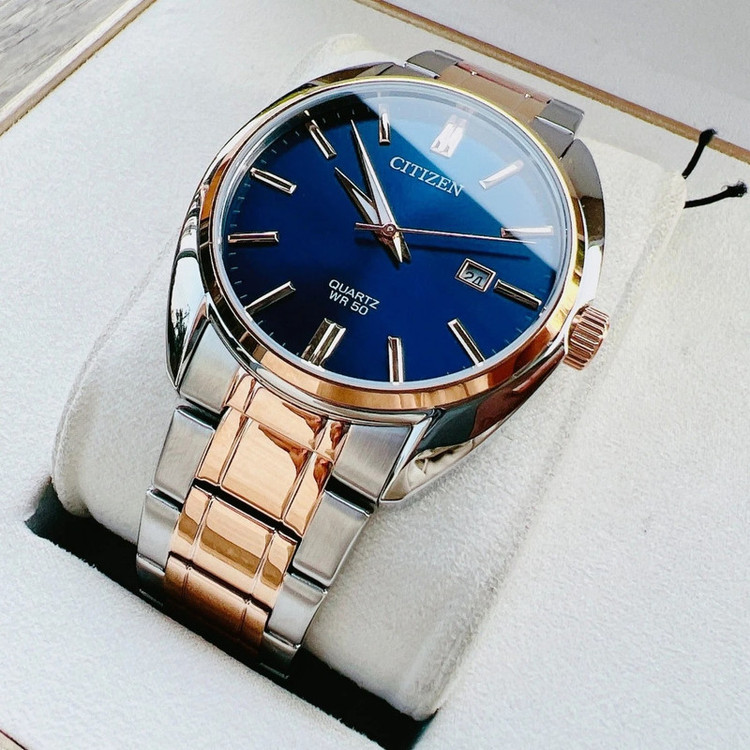 این طرح از ساعت مچی های مردانه برند سیتیزن مناسب ست کلاسیک و مجلسی می باشد و از ظرافت خاص و منحصر به فردی برخوردار است. این مدل از ساعت های برند سیتیزن جزو ساعت های پرفروش این برند می باشد و دارای بند و بدنه استیل با ترکیب رنگ نقره ای و رزگلد و سرمه ای بوده و در عین ظرافت صاحب جذابیت و ابهت بی نظیری است. همچنین دارای نمایشگر روزهای ماه نیز میباشد.