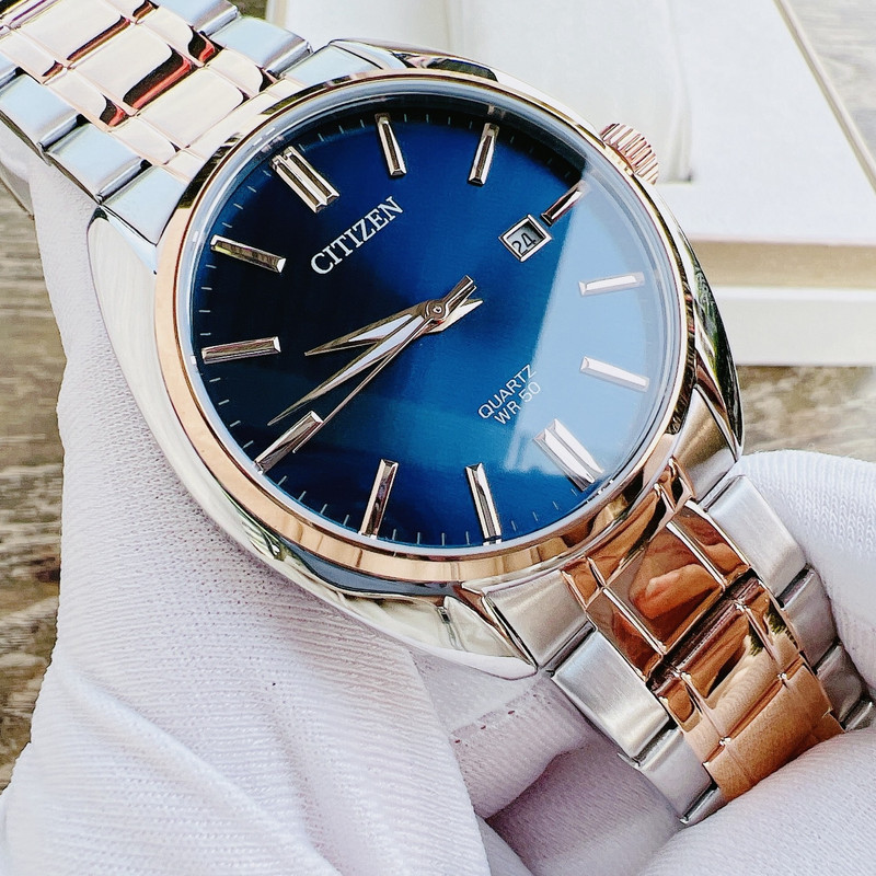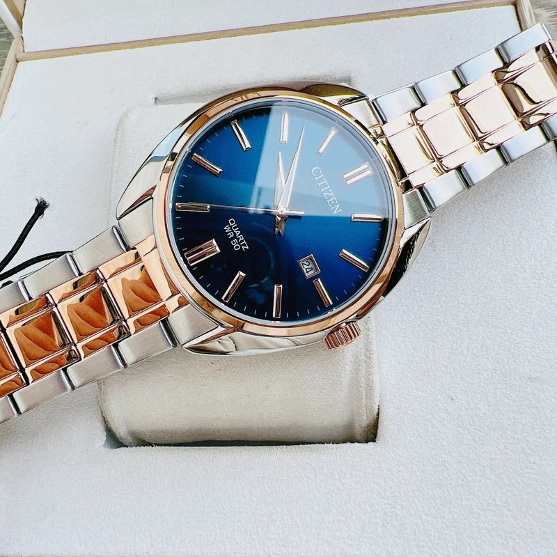 این طرح از ساعت مچی های مردانه برند سیتیزن مناسب ست کلاسیک و مجلسی می باشد و از ظرافت خاص و منحصر به فردی برخوردار است. این مدل از ساعت های برند سیتیزن جزو ساعت های پرفروش این برند می باشد و دارای بند و بدنه استیل با ترکیب رنگ نقره ای و رزگلد و سرمه ای بوده و در عین ظرافت صاحب جذابیت و ابهت بی نظیری است. همچنین دارای نمایشگر روزهای ماه نیز میباشد.