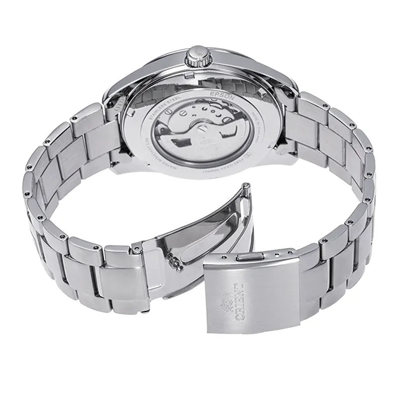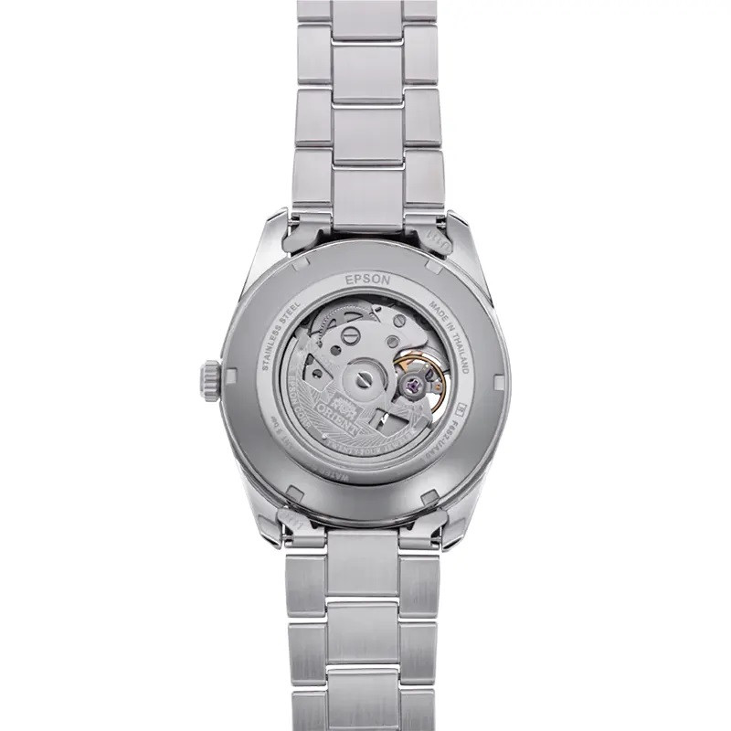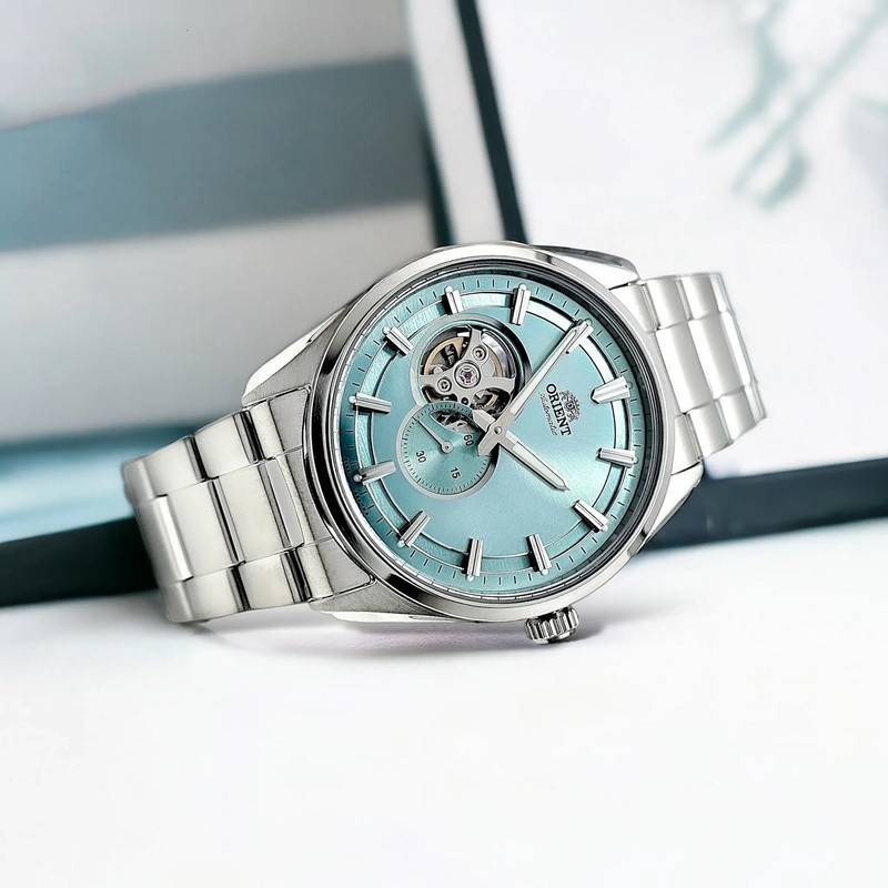 به معنای کامل این طرح از کمپانی اورینت یک شاهکار میباشد. دارای یک صفحه با زنگ منحصر به فرد با یک پنجره نیمه اسکلتی در ساعت 9 است که با دایره دوم کوچک در ساعت 6 همپوشانی دارد، و یک قاب لبه دار که حضوری قوی را به نمایش می گذارد. سبک معاصر آن نیمه اسکلت را به یکی از محبوب ترین مدل ها در سراسر جهان تبدیل کرده است. رنگهای صفحه حسی زنده به مجموعه ساعتها میبخشند و به ویژه برای مخاطبان جوانتر جذاب میشوند. صفحه های آبی روشن با عقربه های نقره ای رنگ و شاخص های اعمال شده همراه شده اند. هارمونی و کنتراست عالی رنگ ها، Semi Skeleton را جذاب تر می کند. قاب پشتی آشکار، کالیبر مکانیکی داخلی خودکار (با سیم پیچی) F6S22 را نشان می دهد که به دلیل ارائه دقت ثابت و ذخیره انرژی 40 ساعت شناخته شده است. این یک ساعت مکانیکی کاربردی است که برای استفاده روزانه ایده آل است.