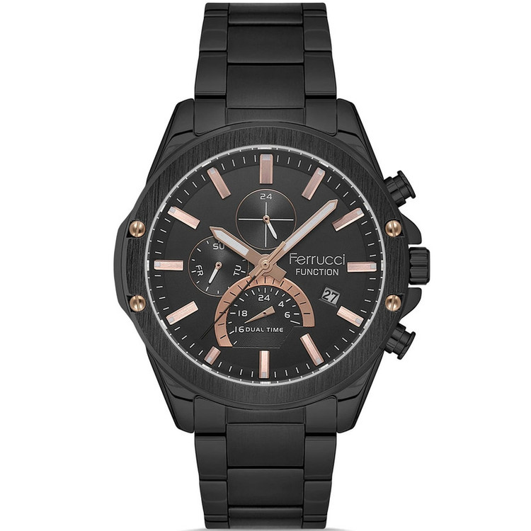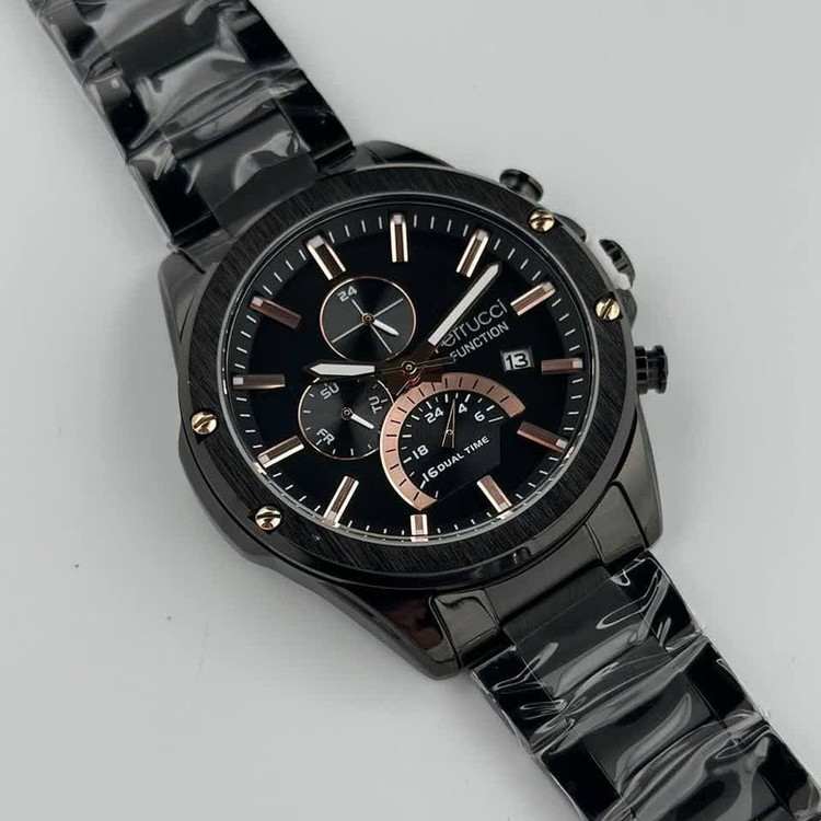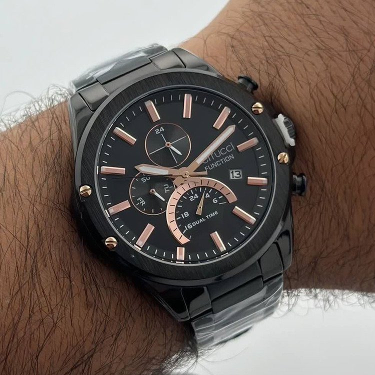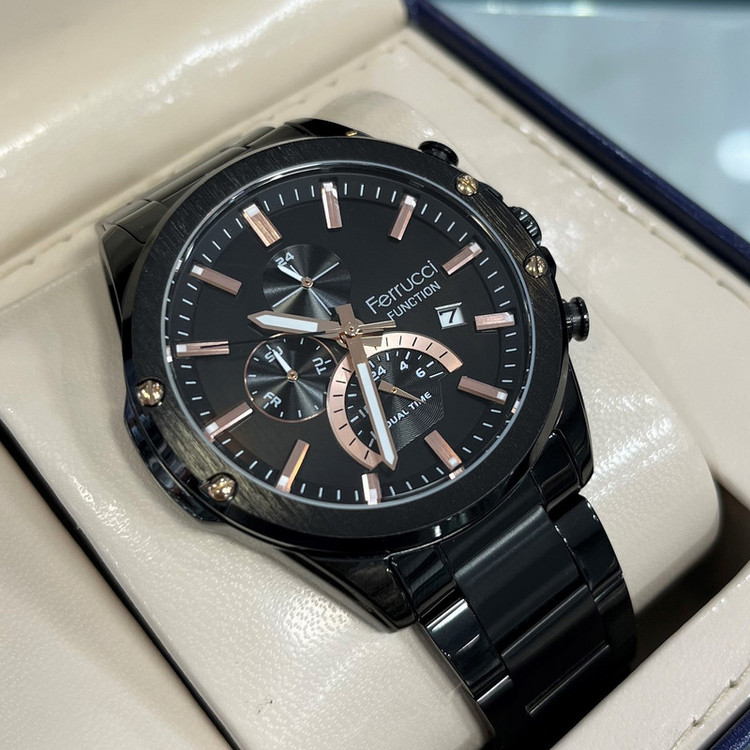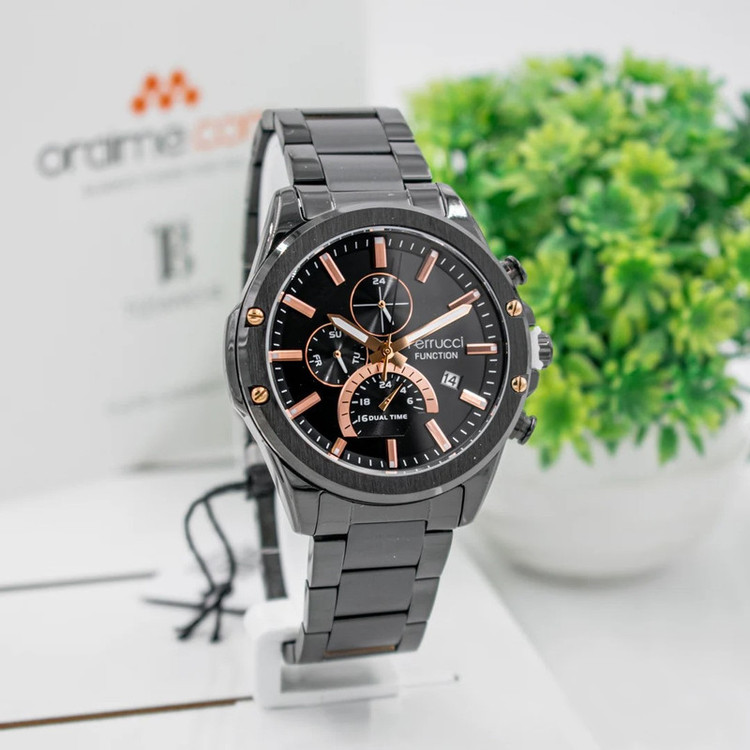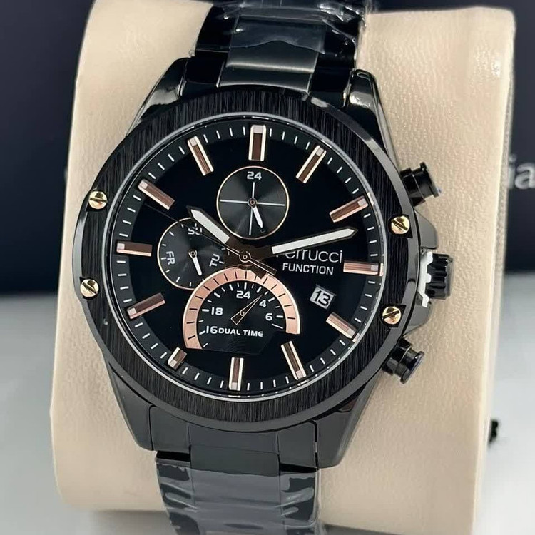 این طرح از برند ساعت مردانه فروچی با طراحی خاص خود برای تیپهای مجلسی بسیار مناسب میباشد. بند و بدنه ی این ساعت فروچی از جنس استیل است و از رنگهای مشکی و رزگلد در آن استفاده شده است. از ویژگیهای منحصر به فرد این ساعت میتوان به طراحی ساده ی ساعت اشاره کرد که برای تیپهای مجلسی بسیار مناسب میباشد و همچنین طراحی صفحه ی این طرح از ساعت فروچی بسیار ساده و شیک است که چشم هر بیننده ای را خیره میکند. همچنین این ساعت تقویم دار بوده و دارای نمایشگر روزهای ماه و هفته و نمایشگر وضعیت 24ساعته است. این ساعت فروچی دو زمانه میباشد.