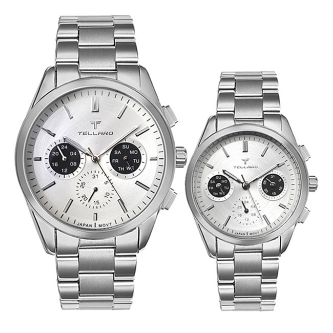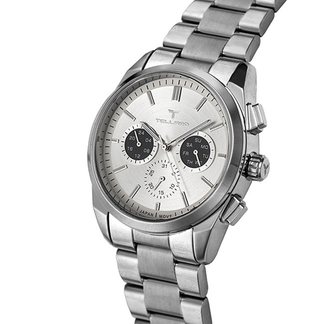 ساعت مردانه tellaro یک اکسسوری بسیار شیک و جذاب کلاسیک مخصوص آقایان شیک پوش می باشد و تنوع بسیار زیادی دارد. برند مشهور tellaro یک شرکت تولید کننده انواع ساعت متعلق به کشور چین می باشد.اما اصالت این برند و طراحی آن متعلق به کشور ایتالیا میباشد تنوع بسیار زیاد و کیفیت مطلوب محصولات به ویژه انواع ساعت مردانه از این برند، سبب محبوبیت آن به ویژه در کشورهای خاورمیانه است. جالب است بدانید،موتور بکارگیری شده در ساعت های مچی برند tellaro ساخت کشور ژاپن می باشد. کشور ژاپن در عرصه تولید انواع ساعت و موتور ساعت در سراسر جهان شهرت زیادی دارد. ترکیب ظاهر کلاسیک با تلفیق تکنولوژی مدرن یکی از اصلی ترین دلایل محبوبیت ساعت مچی های این برند ایتالیایی می باشد. تلارو با ارائه طرح ها و مدل های بسیار متنوع ساعت مچی توانست در کمترین زمان بین آقایان ایرانی محبوبیت زیادی پیدا کند. صفحه نمایش اکثر مدل های ساعت مچی مردانه برند tellaro به شکل دایره می باشد. نوع کارکرد این ساعت ها از طرح کلاسیک الهام گرفته شده و به شکل عقربه ای یا به اصطلاح آنالوگ می باشد. جنس بدنه ساعت های مچی این برند اکثراً از فلز است و خاصیت ضد زنگ دارد. بند این ساعت ها از جنس استیل ضد زنگ یا چرم مصنوعی درجه یک و شیشه آن هاردلکس می باشد که ظاهری بسیار جذاب و شیک دارد که بسیار مقاوم هستند. نمایش تاریخ، کرونوگراف، سرعت سنج از جمله امکانات این ساعت ها هستند. قفل بند آن ها نیز تاشو با محافظ است. رنگ پس زمینه صفحه نمایش این ساعت های مچی نیز دارای طرح ها و زیبا و متنوع است و رنگ هایی مانند سفید، طلایی و نقره ای دارد. نوع بند و نوع قفل یکی از مهمترین ویژگی هایی است که هنگام خرید ساعت مچی باید به آن توجه داشته باشید. ساعت های دارای بند فلزی به صورت قفل مخفی فشاری و ساعت های بند چرمی به صورت بندینکی بسته می شوند. هنگام خرید ساعت به سایز مچ و رنگ پوست توجه داشته باشید و نوع بند و رنگ ساعت را بر این اساس انتخاب نمایید.
