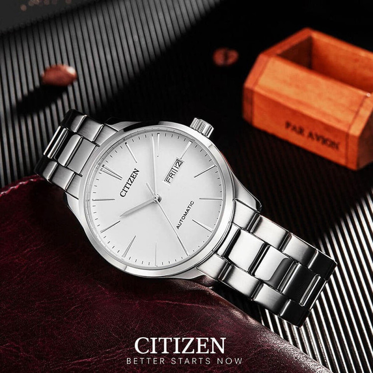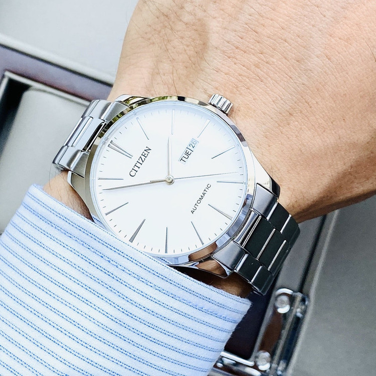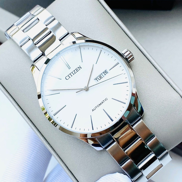 این مدل از ساعت مچی های مردانه برند سیتیزن دارای بند و بدنه ی استیل به رنگ نقره ای و صفحه ی سفید بوده و آن را صاحب ابهت و جذابیت بی نظیری کرده است. این ساعت برند سیتیزن اتوماتیک بوده و قابلیت شارژ با حرکت دست را دارد. از ویژگی های منحصر بفرد این طرح از ساعت سیتیزن میتوان به قابلیت نمایشگر روزهای ماه و هفته اشاره کرد.
