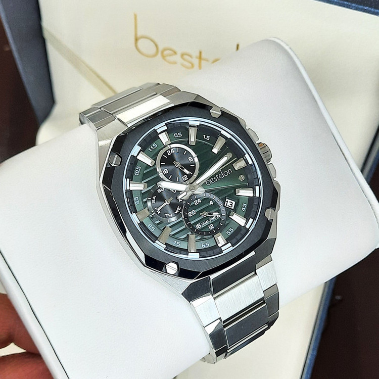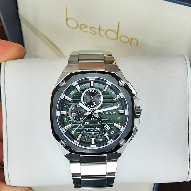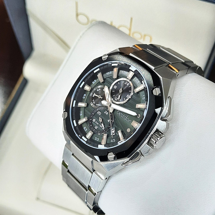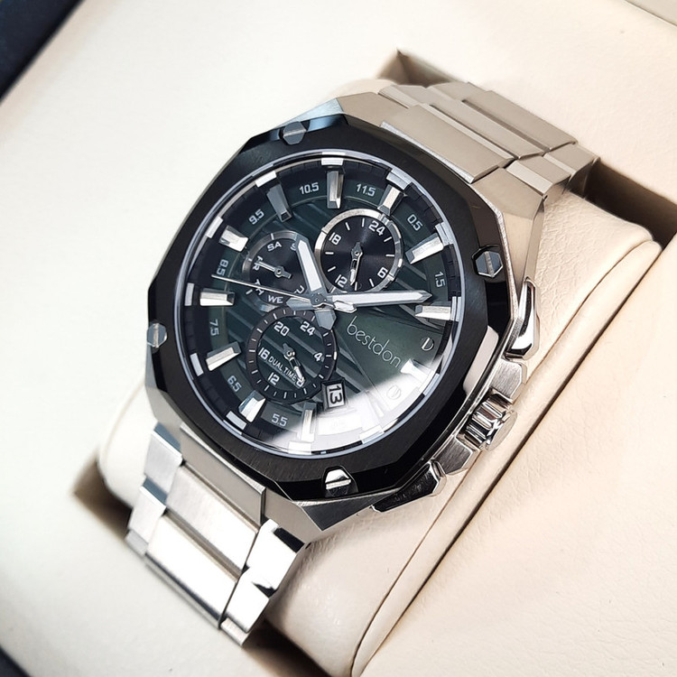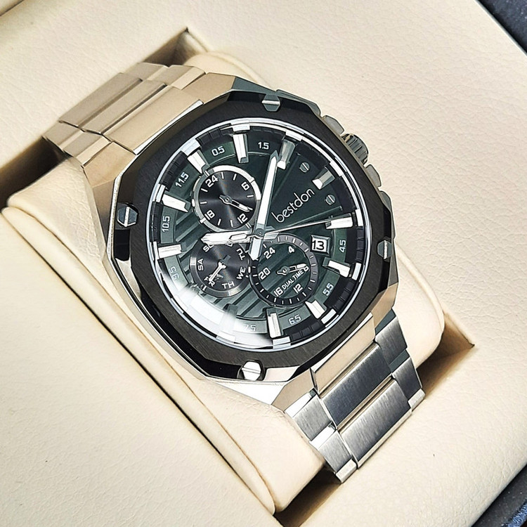 ویژگیهای ساعت : عقربههای شبتاب , قابلیت نمایش 24 ساعته , قابلیت نمایش ساعت دوم , تاریخ شمار , شیشه ضدخش , ضد آب , شیشه ضد انعکاس