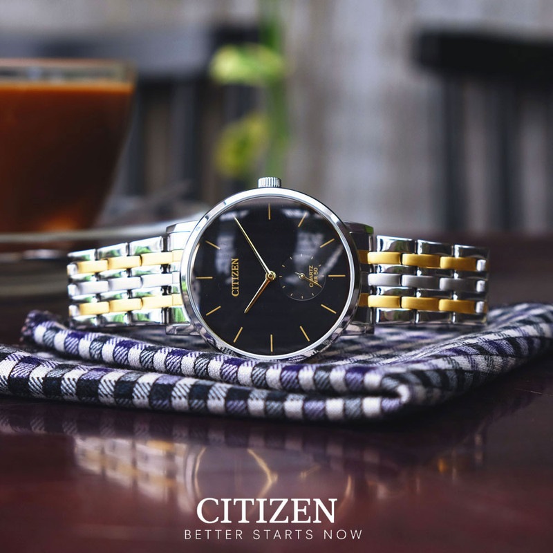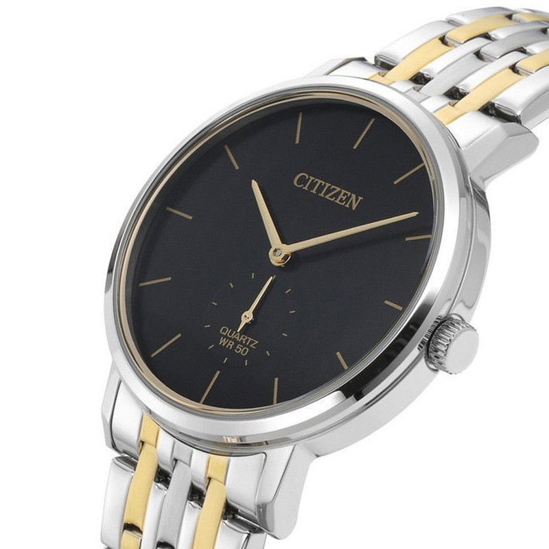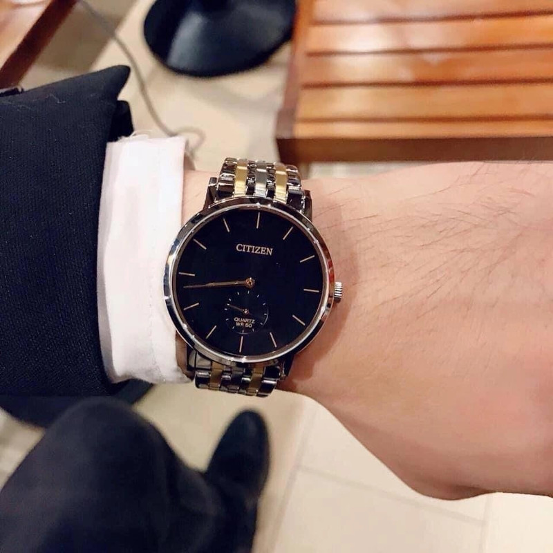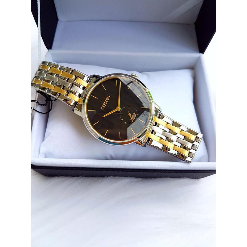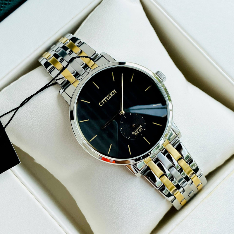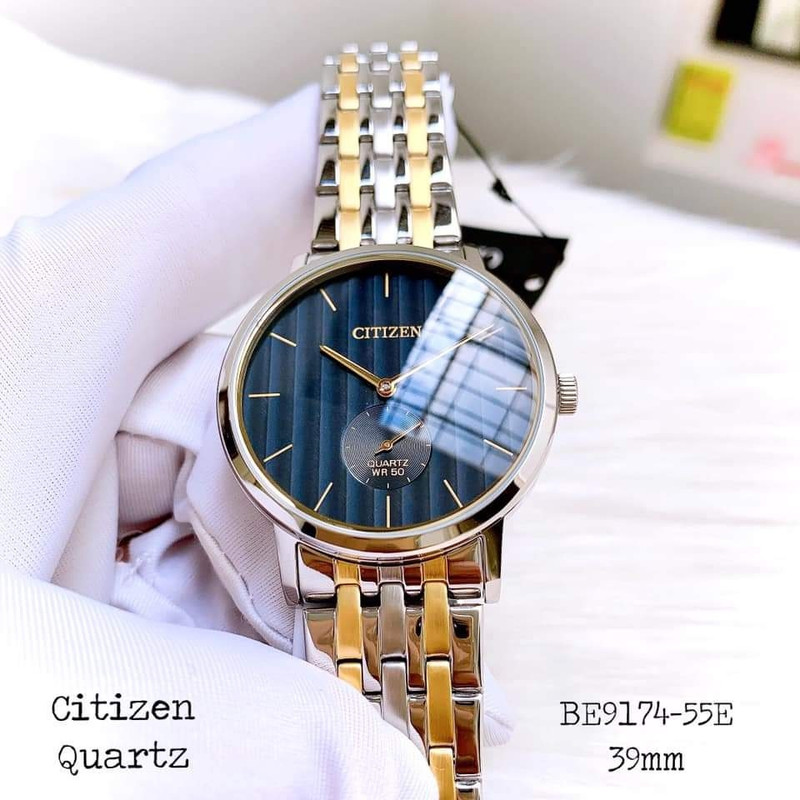 این طرح از ساعت مچی های مردانه کلاسیک برند سیتی زن دارای طراحی چشمگیر و ظریفی است که در عین سادگی جذابیت منحصر به فردی را به نمایش می گذارد. این ساعت مچی برند سیتی زن دارای بدنه استیل نقره ای و بند استیل نقره ای طلایی و صفحه مشکی رنگ با عقربه های طلایی می باشد. این طرح مورد پسند اکثر آقایان میانسال میباشد. علی رغم قیمت پایین، این ساعت سیتیزن کیفیت عالی هم دارد و این ساعت میتواند کادوی مناسبی برای مردان باشد. همچنین این ساعت دارای نمایشگر ثانیه نیز میباشد.
