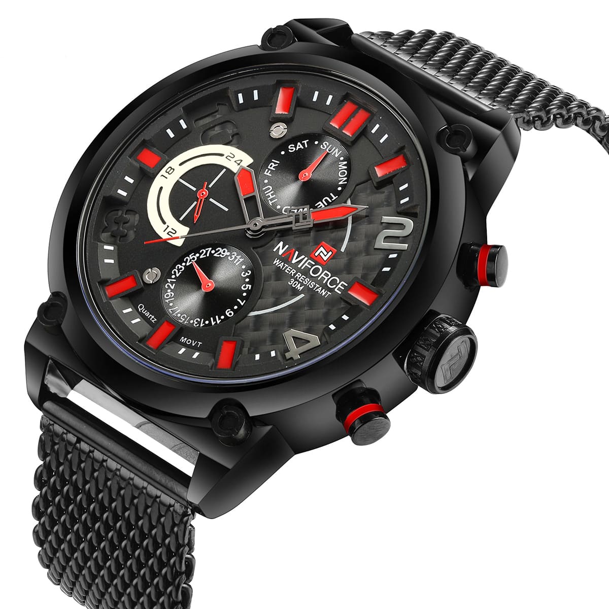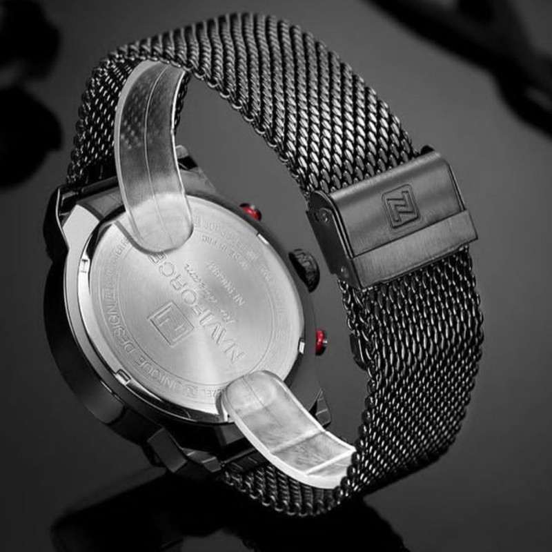 ساعت اورجینال NAVIFORCE فول تایم دارای نشانگر 24 ساعته و روزهای هفته و ماه است شیشه تقویت شده ضد خش می باشد دارای دفترچه راهنما و کارت گارانتی و هارد باکس مخصوص ساعت با حک برند NAVIFORCE
