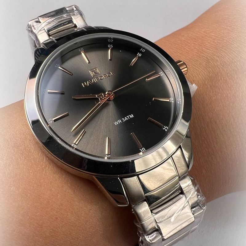 ساعت مچی عقربه ای زنانه نیوی فورس 5025 برای بهتر شدن استایلتان توصیه می شود که رنگ ساعت مچی خود را با رنگ استایل خود هماهنگ کنید و یا حتی می توانید ازاکسسوری های زیبا در کنار ساعت مچی خود استفاده نمایید. تکنولوژی ساخت ساعت مچی زنانه نیوی فورس کوارتز می باشد به این معنی است که ساعت مچی منبع انرژی خود را از باطری دریافت می کند. همانطور که می دانید موتور قلب یک ساعت است و عملکرد تمام اجزاء ساعت به موتور بستگی دارد از این رو یک جز مهم به حساب می آید . کشور سازنده ی موتور ساعت مچی نیوی فورس کشور ژاپن می باشد. ساعت مچی زنانه نیوی فورس دارای عقربه ها و علائم هم رنگ خود ساعت می باشد. برند نیوی فورس به زبان لاتین در صفحه ساعت نوشته شده است و به زیبایی این ساعت جذاب افزوده است. قفل ساعت ضامن دار و از جنس استیل رنگ ثابت می باشد. خریداین محصول برای شما خریداران گرامی می باشد تا با خیالی راحت خریدی مطمئن و به صرفه را تجربه نمایید.