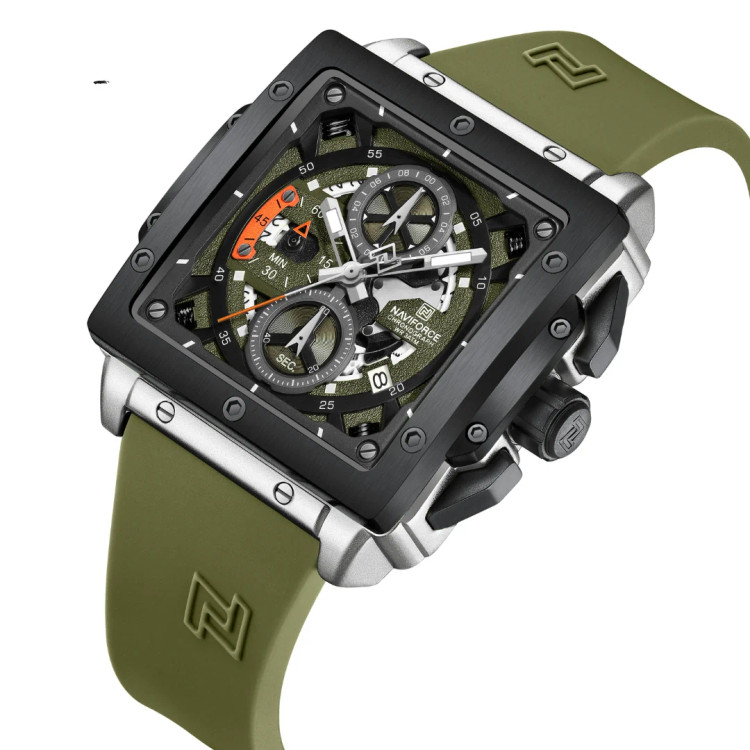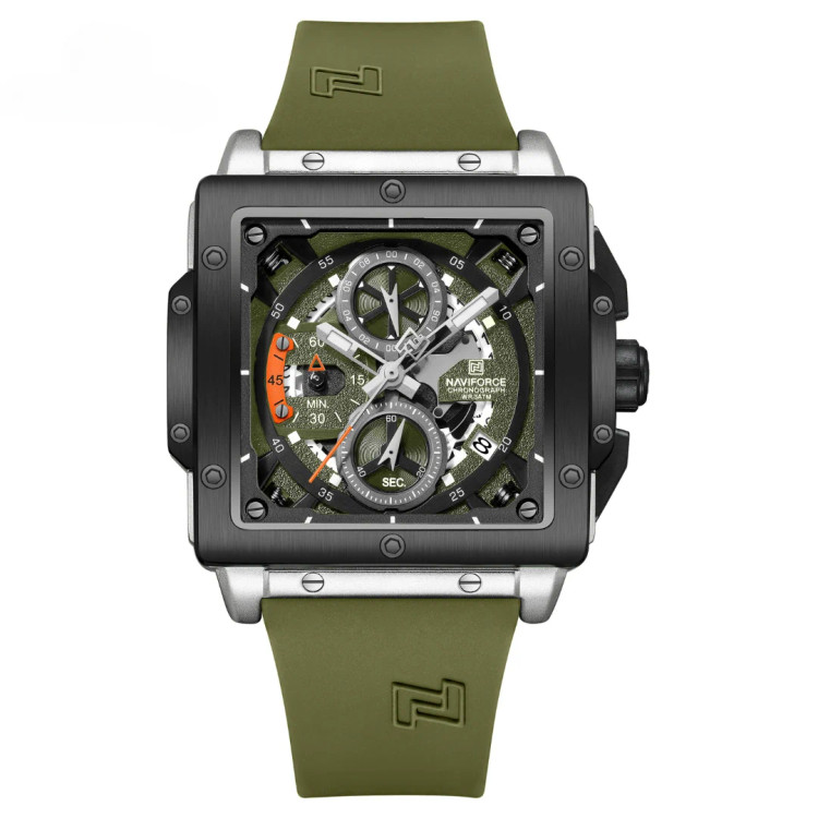 Naviforce NF8064 طراحی مدرن را با عملکرد عملی ترکیب می کند. صفحه کرونوگراف مربعی چشمگیر و بند سیلیکونی بادوام آن ظاهری اسپرت و در عین حال زیبا را ارائه می دهد. این ساعت دارای صفحه نمایش تاریخ، عقربه های درخشان و مقاومت در برابر آب 3 بار است که آن را برای فعالیت های روزانه از جمله شنا و دوش آب سرد عالی می کند. از مواد مستحکم ساخته شده است و با حرکت کوارتز دقیق نیرو می گیرد که طول عمر و زمان سنجی قابل اعتماد را تضمین می کند