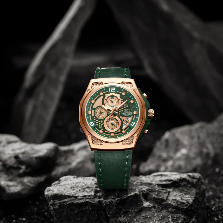 ساعت Naviforce NF8051L یک قاب تعبیهشده، صفحهی بافت لانه زنبوری و حرکت کرنوگراف را ترکیب میکند و آن را از بقیه متمایز میکند. دارای یک بند چرم طبیعی مینیمالیستی است که روی پوست راحت است و کاملاً مکمل رنگ و طرح صفحه است و ظاهری یکپارچه و هماهنگ را ایجاد می کند. این ساعت همچنین دارای سه صفحه فرعی کاربردی است که هم کاربردی بودن و هم جذابیت بصری را به طراحی آن اضافه می کند. همچنین، عقربه های درخشان و مقاومت 3ATM در برابر آب، سایش روزانه بدون نگرانی را تضمین می کند
