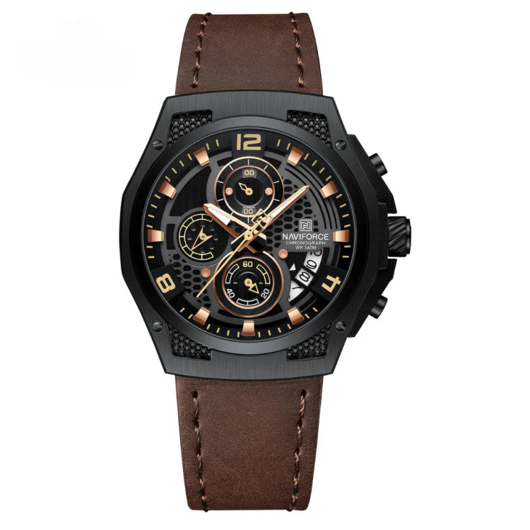 ساعت Naviforce NF8051L یک قاب تعبیهشده، صفحهی بافت لانه زنبوری و حرکت کرنوگراف را ترکیب میکند و آن را از بقیه متمایز میکند. دارای یک بند چرم طبیعی مینیمالیستی است که روی پوست راحت است و کاملاً مکمل رنگ و طرح صفحه است و ظاهری یکپارچه و هماهنگ را ایجاد می کند. این ساعت همچنین دارای سه صفحه فرعی کاربردی است که هم کاربردی بودن و هم جذابیت بصری را به طراحی آن اضافه می کند. همچنین، عقربه های درخشان و مقاومت 3ATM در برابر آب، سایش روزانه بدون نگرانی را تضمین می کند
