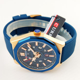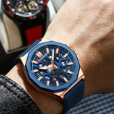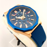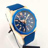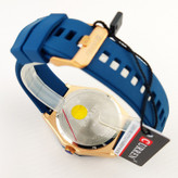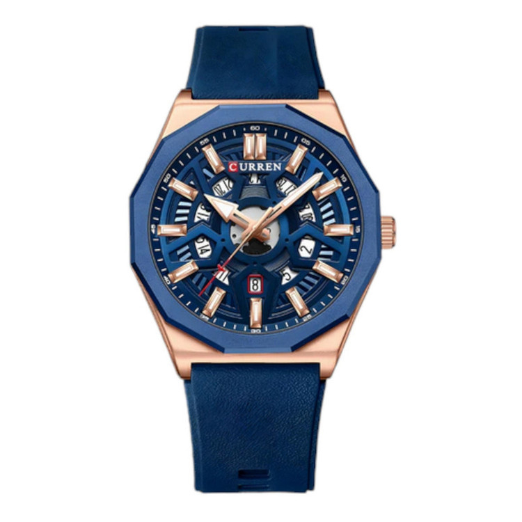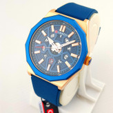 ساعت مچی عقربه ای مردانه برند کارن مدل 8437 اسپرت جدیدترین مدل از برند CURREN است که دارای موتور قدرتمند کوارتز با تقویم روزشمار و عقربه های شب تاب است.این نوع محصول نیروی مورد نیاز خود را از طریق یک باتری تامین میکند. این مدل ساعتها در اندازهگیری زمان بسیار دقیق و قابل اعتماد است.این ساعت دارای جنس بدنه استیل ضخیم مات به رنگ رزگلد با قاب آبی رنگ نقش الماسی است.جنس بند ساعت سیلیکونی آبی رنگ است و صفحه ساعت نقشدار برجسته است که جلوه ای منحصربفرد به ساعت بخشیده.جنس شیشه ساعت معدنی تقویت شده و مقاوم در برابر خراش است. برند شرکت سازنده بر روی صفحه،قفل و درب ساعت به زیبایی حک شده است.این ساعت در برابر پاشش آب مقاوم است و ضمنا ساعت را نمیتوان در حمام گرم استفاده کرد.این ساعت عقربهای مردانه دارای ظاهری شیک و جذاب بوده و برای هدیه و استفاده در هر شرایطی کاملا مناسب خواهد بود.ارسال بهمراه کارت شرکت سازند و جعبه ساعت بالشتکدار کادویی و همچنین یک عدد باتری اضافه.