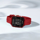 قاب مربعی شیک پلی کربنات : شکل مربعی و جنس نیمه شفاف آن به این ساعت زیبایی منحصر به فرد و مدرنی میبخشد. این ساعت سبک اما بادوام است و برای استفاده روزانه عالی است.
