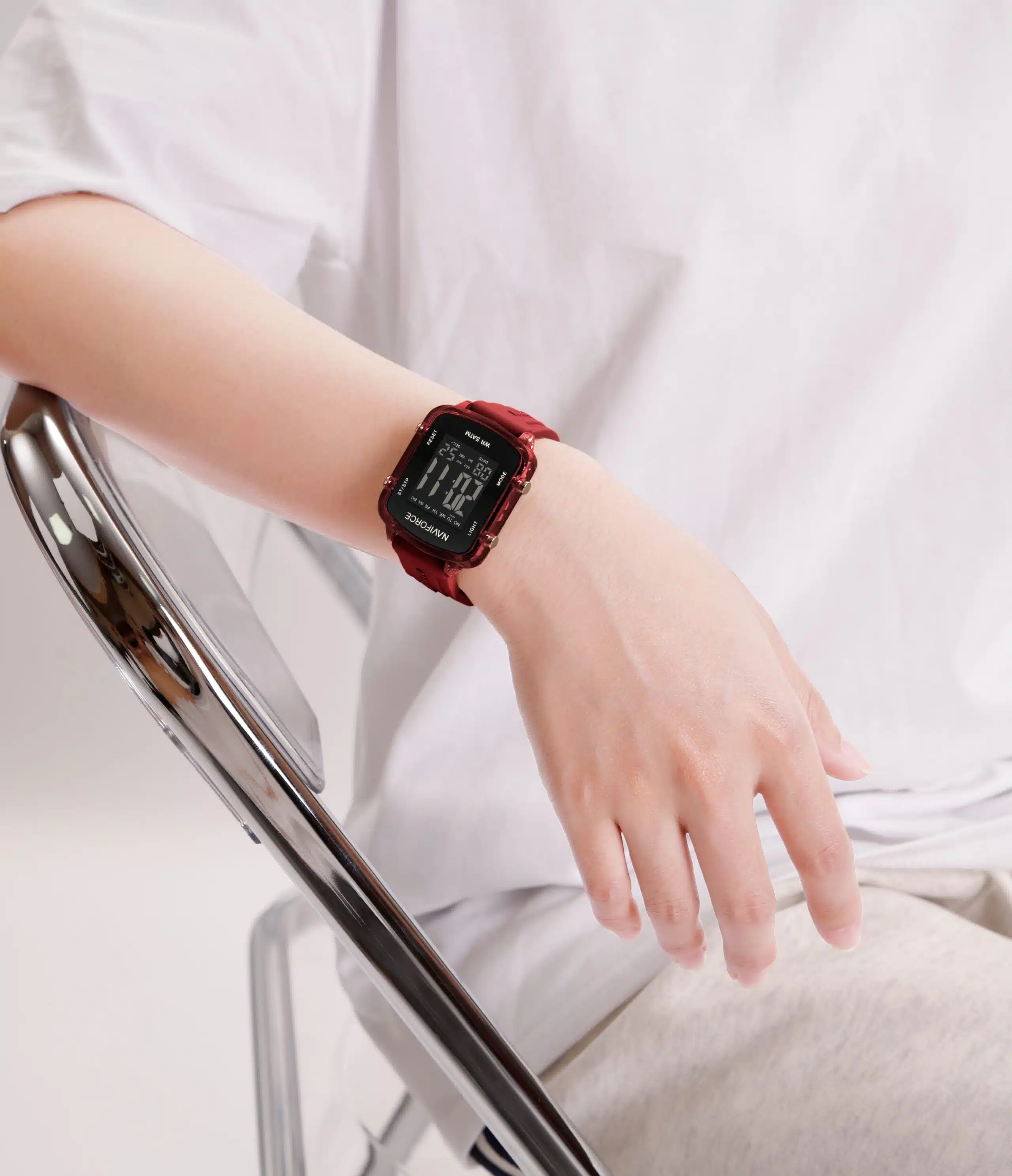 قاب مربعی شیک پلی کربنات : شکل مربعی و جنس نیمه شفاف آن به این ساعت زیبایی منحصر به فرد و مدرنی میبخشد. این ساعت سبک اما بادوام است و برای استفاده روزانه عالی است.