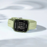 قاب مربعی شیک پلی کربنات : شکل مربعی و جنس نیمه شفاف آن به این ساعت زیبایی منحصر به فرد و مدرنی میبخشد. این ساعت سبک اما بادوام است و برای استفاده روزانه عالی است.