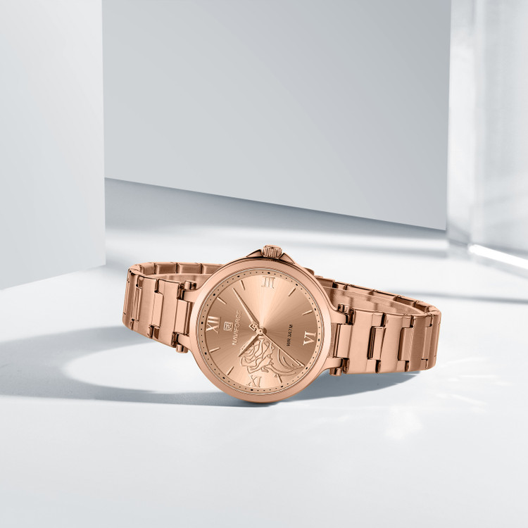 ساعتی زنانه با بدنهای گرد و زیبا، تزئینشده با الگوی گل رز برجسته روی صفحه و شمارۀ رومی که احساس لطیف و کلاسیکی را منتقل میکند. موتور دقیق کوارتز ژاپنی تضمینی برای نمایش زمان دقیق و قابل اعتماد است. بند استیل ضدزنگ درخشان، ترکیب دوام و زیبایی است. قطر قاب 34 میلیمتر و ضخامت 9 میلیمتر، آن را مناسب استفاده روزانه و قرارگیری آسان زیر آستین لباس میسازد. مقاومت تا فشار 3ATM به همراه شیشهٔ معدنی سختشده از این ساعت در برابر شرایط روزمره محافظت میکنند. این مدل تنها 70 گرم وزن دارد و بند آن تا حدود 220 میلیمتر قابل تنظیم است. مخاطب این ساعت زنانی هستند که به دنبال ترکیب زیباییهای کلاسیک و کاربردیگری مدرن هستند.