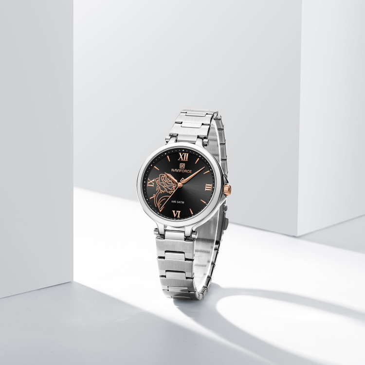 ساعتی زنانه با بدنهای گرد و زیبا، تزئینشده با الگوی گل رز برجسته روی صفحه و شمارۀ رومی که احساس لطیف و کلاسیکی را منتقل میکند. موتور دقیق کوارتز ژاپنی تضمینی برای نمایش زمان دقیق و قابل اعتماد است. بند استیل ضدزنگ درخشان، ترکیب دوام و زیبایی است. قطر قاب 34 میلیمتر و ضخامت 9 میلیمتر، آن را مناسب استفاده روزانه و قرارگیری آسان زیر آستین لباس میسازد. مقاومت تا فشار 3ATM به همراه شیشهٔ معدنی سختشده از این ساعت در برابر شرایط روزمره محافظت میکنند. این مدل تنها 70 گرم وزن دارد و بند آن تا حدود 220 میلیمتر قابل تنظیم است. مخاطب این ساعت زنانی هستند که به دنبال ترکیب زیباییهای کلاسیک و کاربردیگری مدرن هستند.