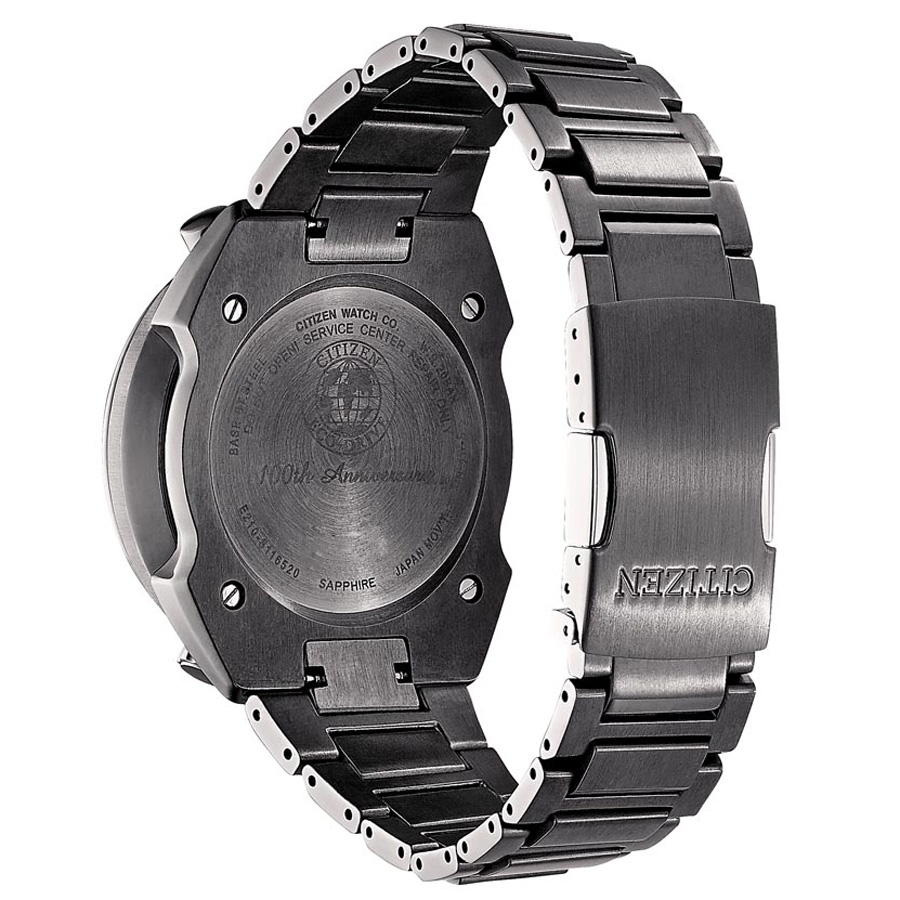با ادای احترام به مدل قدیمی سیتیزن بولهد ۱۹۷۳، ساعت جدید و مدرن صدمین سالگرد سیتیزن، نسخه محدود تیسونو کرونو ریسر، با طراحی قاب منحصر به فرد و ترکیب رنگهای شیک، مطمئناً روی مچ دست شما خودنمایی میکند. تیسونو کرونو ریسر که با دست مونتاژ شده، دارای کرونومتر ۱/۵ ثانیهای، زنگ هشدار، تاچیمتر، قابلیت بازگشت آنی، ذخیره انرژی و تاریخ است. در اینجا با قاب و بند استیل ضد زنگ با روکش یونآبکاری شده مشکی و صفحه مشکی با تزئینات طلایی دیده میشود. مجهز به فناوری Eco-Drive ما - با نور، هر نوری کار میکند. هرگز به باتری نیاز ندارد. شماره کالیبر E210.
