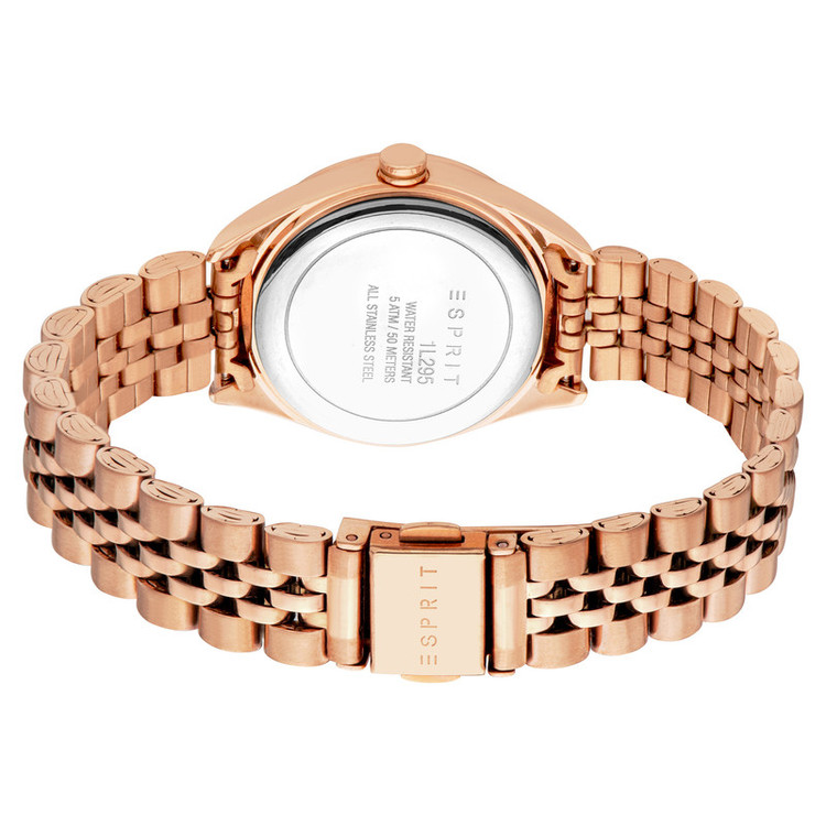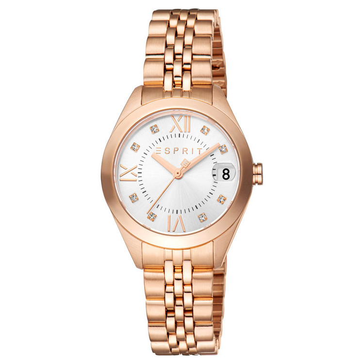 ساعت زنانه Esprit مدل ES1L295M2045 از کالکشن Madison با طراحی نازک و رنگ رزگلد جذاب، جلوهای شیک و امروزی دارد. قاب 30 mm آن از استیل ضدزنگ با روکش رزگلد، هماهنگ با بند فلزی، ظاهری دلنشین و لوکس فراهم میکند. صفحهی نقرهای ساده و خوانا همراه عقربههای آنالوگ و پنجره تاریخ، ترکیبی از زیبایی و کارایی را ارائه میدهد. این ساعت با موتور دقیق کوارتز، مقاومت 5 ATM در برابر آب است
