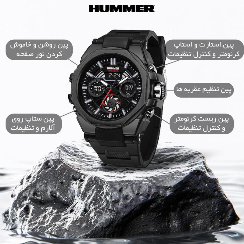 قابلیتهای ساعت : تایمر , عقربههای شبتاب , نمایش 24 ساعته , نمایش ساعت دوم , نور پس زمینه , تاریخ شمار , آلارم , کرنوگراف , شیشه ضدخش , ضد آب