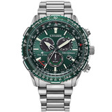 این مدل از ساعت مچی های مردانه برند سیتیزن دارای بدنه و بند استیل نقره ای و سبز بوده و با صفحه سبز رنگ خاص خود صاحب ابهت و جذابیت بی نظیری شده است. این ساعت برند سیتیزن اکودرایو بوده و قابلیت شارژ با نور محیط را دارد. همچنین این ساعت سیتیزن دارای امکانات پرومستر و خلبانی و تنظیم رادیویی و تقویم بی نهایت و وقت جهانی و زمان سنج 24 ساعت و هشدار میباشد. از ویژگی های منحصر بفرد این طرح از ساعت سیتیزن میتوان به قابلیت ذخیره شارژ باطری تا 36ماه و نمایشگر روزهای ماه و هفته و نمایشگر وضعیت 24 ساعته اشاره کرد.