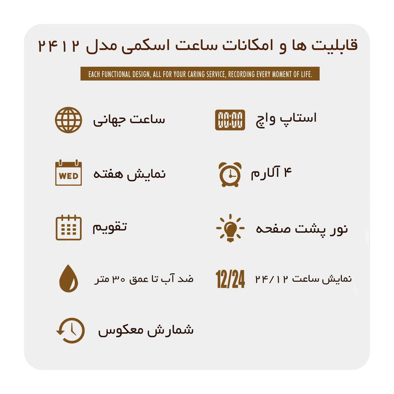 قابلیتهای ساعت : نمایش 24 ساعته , نمایش ساعت دوم , نور پس زمینه , تاریخ شمار , آلارم