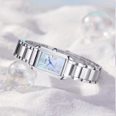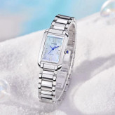 طراحی زنانه و شیک: ترکیب قاب مستطیل با صفحه مادر-پرل و بند استیل نقرهای، حس کلاسیک و لطیفی دارد که برای استفاده رسمی و روزمره مناسب است.