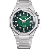 سری جدید ۸ ۸۹۰ با ایجاد تعادل بین استحکام و طراحی ظریف، دارای قاب استیل ضد زنگ نقرهای رنگ هشت ضلعی ۴۲.۶ میلیمتری در کنار بهترین تکنیکهای پرداخت سیتیزن است. این ساعت که تا عمق ۲۰۰ متر در برابر آب مقاوم است و میتواند میدانهای مغناطیسی تا ۱۶۰۰۰ آمپر بر متر را تحمل کند، از کالیبر ۹۰۵۱ با عملکرد بالا بهره میبرد. موتور اتوماتیک از طریق قاب یاقوت کبود پشتی قابل مشاهده است و قادر به حفظ دقت +۲۰ / -۱۰ ثانیه در روز با فرکانس ۲۸۸۰۰ ولت بر ساعت است. در کل، عملکرد فنی برتر این ساعت کاملاً با سبک اسپرت آن مطابقت دارد. این ساعت با بند H-link مخروطی شکل و یکپارچه استیل ضد زنگ نقرهای رنگ و دو سری تاج، در هر شرایطی آماده استفاده است. در زیر شیشه یاقوت کبود، یک صفحه سبز بافتدار با قاب داخلی چرخان، به همان اندازه که کاربردی است، جذاب نیز هست و به دلیل شاخصهای کاربردی و طراحی هوشمندانه عقربههایش، بسیار خوانا است. تاج ساعت در موقعیت ساعت ۲، قاب داخلی چرخان دو جهته را کنترل میکند که در کنار سایر جزئیات، کنتراست ایجاد میکند، صفحه بسیار خوانا در نور به زیبایی میدرخشد، در حالی که یک پنجره تاریخ ساعت ۳، کاربرد بیشتری به طراحی آن میبخشد.