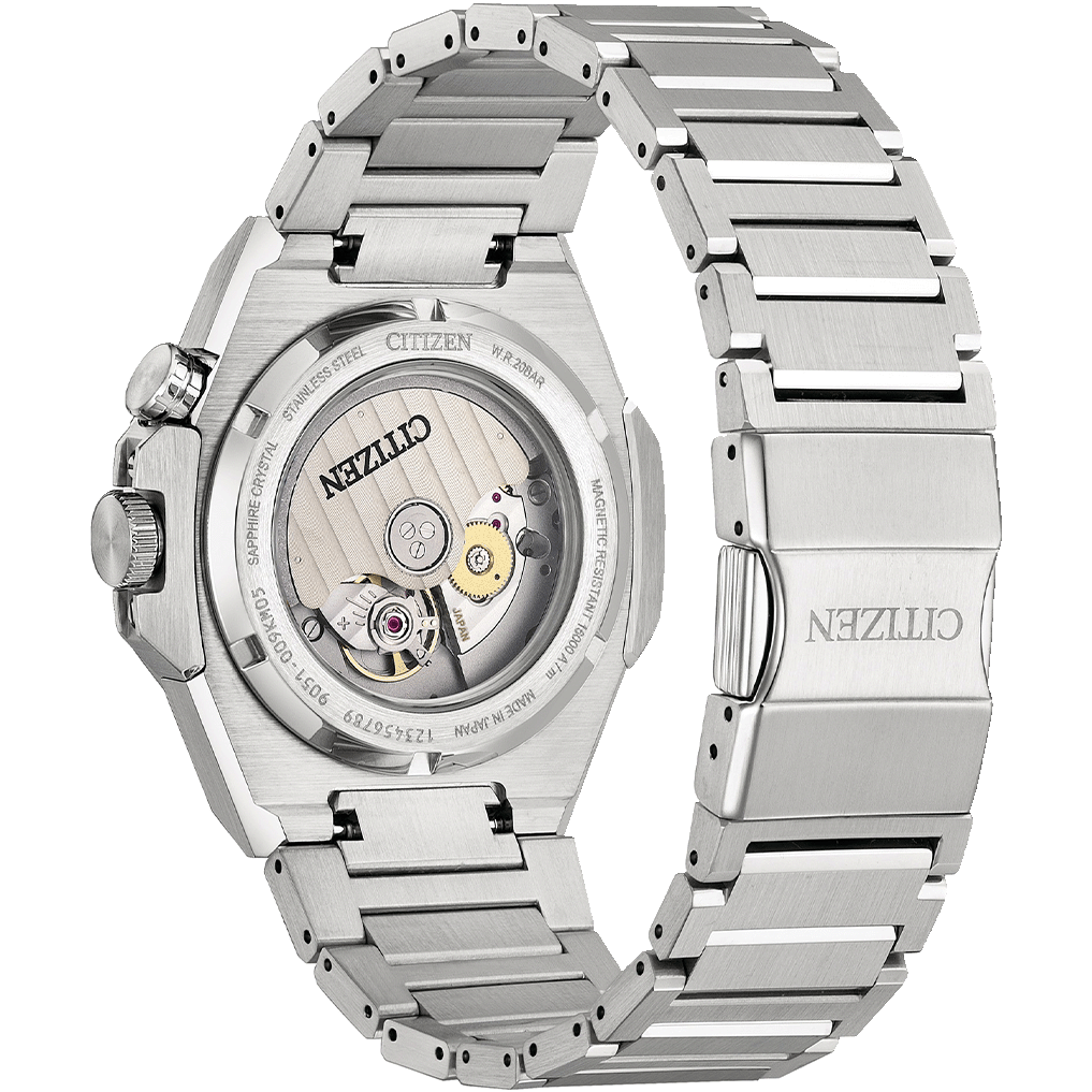 سری جدید ۸ ۸۹۰ با ایجاد تعادل بین استحکام و طراحی ظریف، دارای قاب استیل ضد زنگ نقرهای رنگ هشت ضلعی ۴۲.۶ میلیمتری در کنار بهترین تکنیکهای پرداخت سیتیزن است. این ساعت که تا عمق ۲۰۰ متر در برابر آب مقاوم است و میتواند میدانهای مغناطیسی تا ۱۶۰۰۰ آمپر بر متر را تحمل کند، از کالیبر ۹۰۵۱ با عملکرد بالا بهره میبرد. موتور اتوماتیک از طریق قاب یاقوت کبود پشتی قابل مشاهده است و قادر به حفظ دقت +۲۰ / -۱۰ ثانیه در روز با فرکانس ۲۸۸۰۰ ولت بر ساعت است. در کل، عملکرد فنی برتر این ساعت کاملاً با سبک اسپرت آن مطابقت دارد. این ساعت با بند H-link مخروطی شکل و یکپارچه استیل ضد زنگ نقرهای رنگ و دو سری تاج، در هر شرایطی آماده استفاده است. در زیر شیشه یاقوت کبود، یک صفحه سبز بافتدار با قاب داخلی چرخان، به همان اندازه که کاربردی است، جذاب نیز هست و به دلیل شاخصهای کاربردی و طراحی هوشمندانه عقربههایش، بسیار خوانا است. تاج ساعت در موقعیت ساعت ۲، قاب داخلی چرخان دو جهته را کنترل میکند که در کنار سایر جزئیات، کنتراست ایجاد میکند، صفحه بسیار خوانا در نور به زیبایی میدرخشد، در حالی که یک پنجره تاریخ ساعت ۳، کاربرد بیشتری به طراحی آن میبخشد.