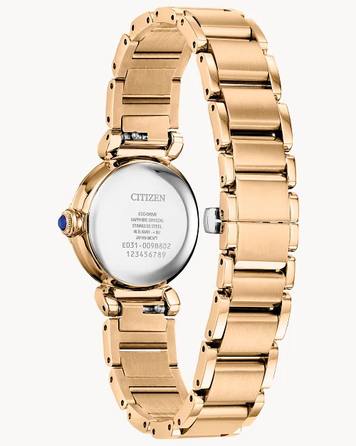 این ساعت با صفحه سفید صدفی ساخته شده از مواد بازیافتی، شامل یک پایه پلی کربنات بازیافتی در زیر صفحه، از طریق قاب و بند استیل ضد زنگ براق به رنگ رزگلد، خودنمایی میکند. صفحه همچنین دارای یک الماس است که به موقعیت ساعت ۸ تمرکز میدهد و با یک کریستال یاقوت کبود تزئین شده است. این ساعت زنانه زیبا که با فناوری اختصاصی Eco-Drive ما که هرگز به باتری نیاز ندارد، با هر نوری به طور پایدار تغذیه میشود، ظاهری آراسته و عالی با عملکردی قدرتمند دارد. کالیبر E031.