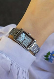 این مدل با قاب مستطیلی، صفحه مینیمال و ترکیب رنگ گرم و شیک، حس یک ساعت کلاسیک واقعی را منتقل میکند. بند استیل ضدزنگ و شیشه معدنی، ظاهر ساعت را جذاب و در عین حال مقاوم نگه میدارد.