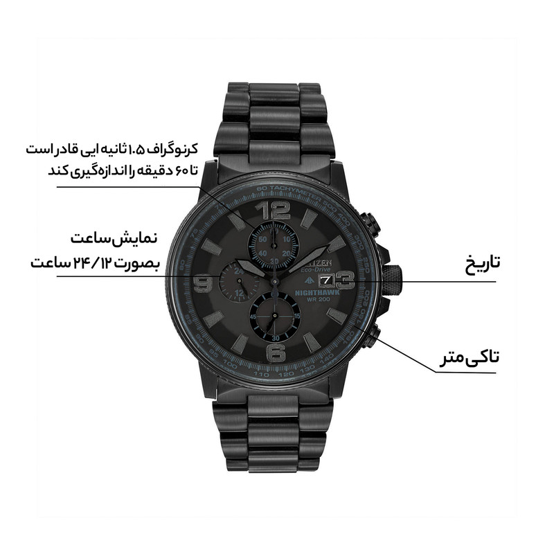 این مدل از ساعت مچی های مردانه برند سیتیزن دارای بدنه و بند استیل مشکی بوده و با صفحه مشکی خاص خود صاحب ابهت و جذابیت بی نظیری شده است. این ساعت برند سیتیزن اکودرایو بوده و قابلیت شارژ با نور محیط را دارد و نیز دارای امکان ممانعت از شارژ بیش از حد باطری و اخطار اتمام شارژ باطری می باشد. از امکانات ویژه این ساعت میتوان به پرومستر و زمانسنج 60دقیقه ای نمایشگر روزهای ماه و وضیت 24ساعته و ذخیره شارژ باطری تا 7ماه اشاره کرد.