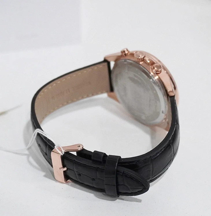 بدنه ساعت از استیل ضدزنگ ساخته شده و با آبکاری رزگلد جلوهای لوکس به آن داده است. شیشه مینرال گلس از صفحه در برابر خطوخشهای سطحی محافظت میکند. بند چرمی طبیعی، راحتی و انعطاف بالایی دارد و باعث میشود این مدل روی مچ دست بسیار سبک و خوشاحساس باشد. قطر حدود 44 میلیمتری قاب، اندازهای استاندارد و محبوب میان ساعتهای مردانه است.