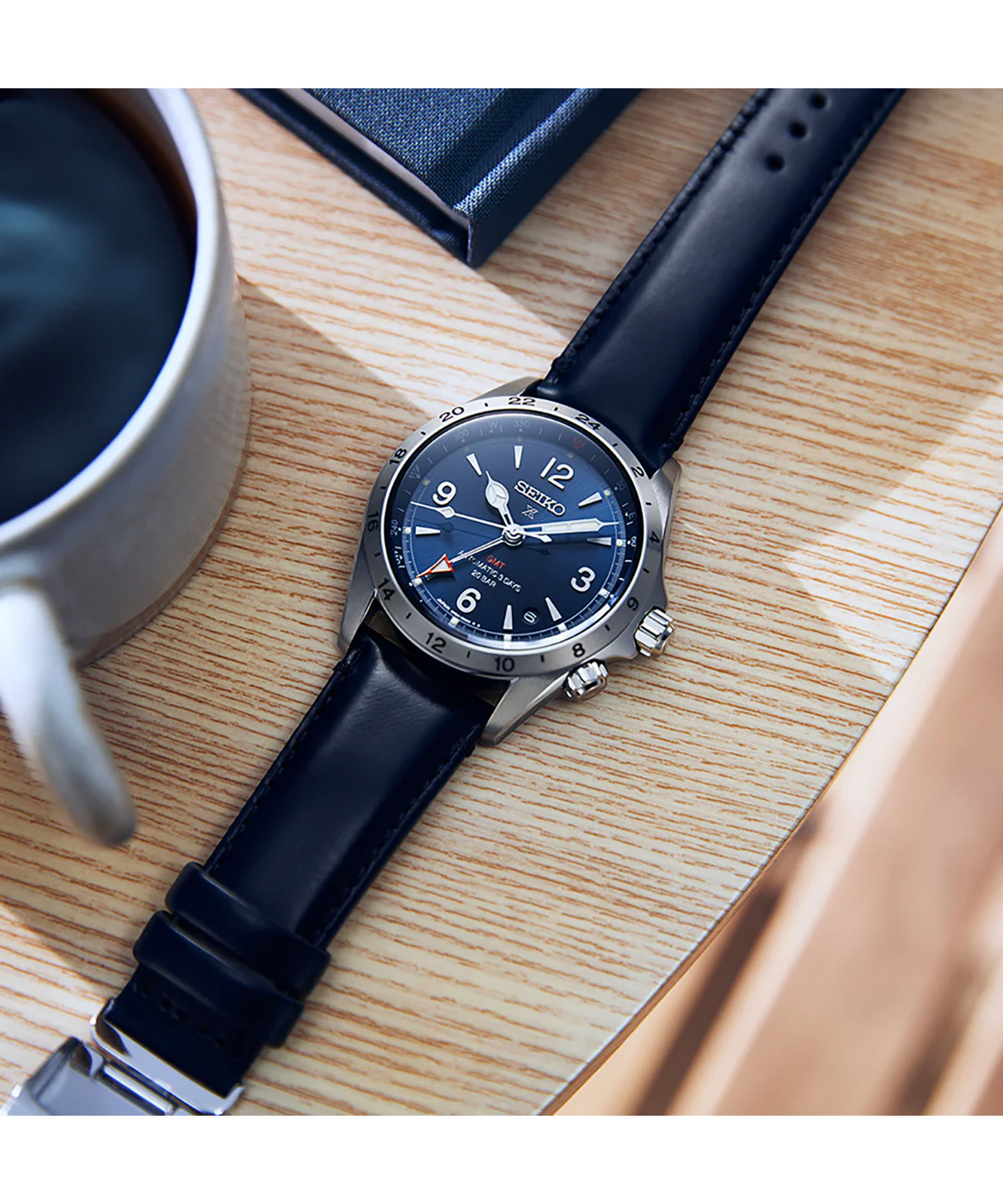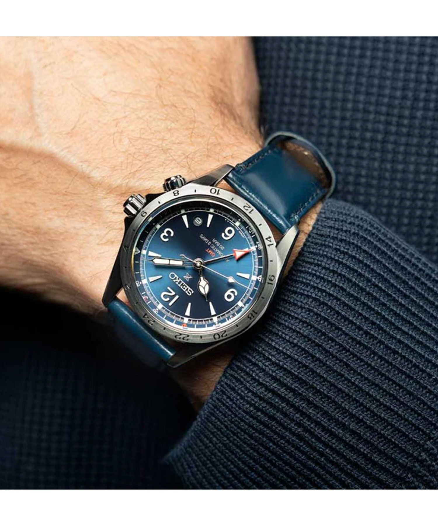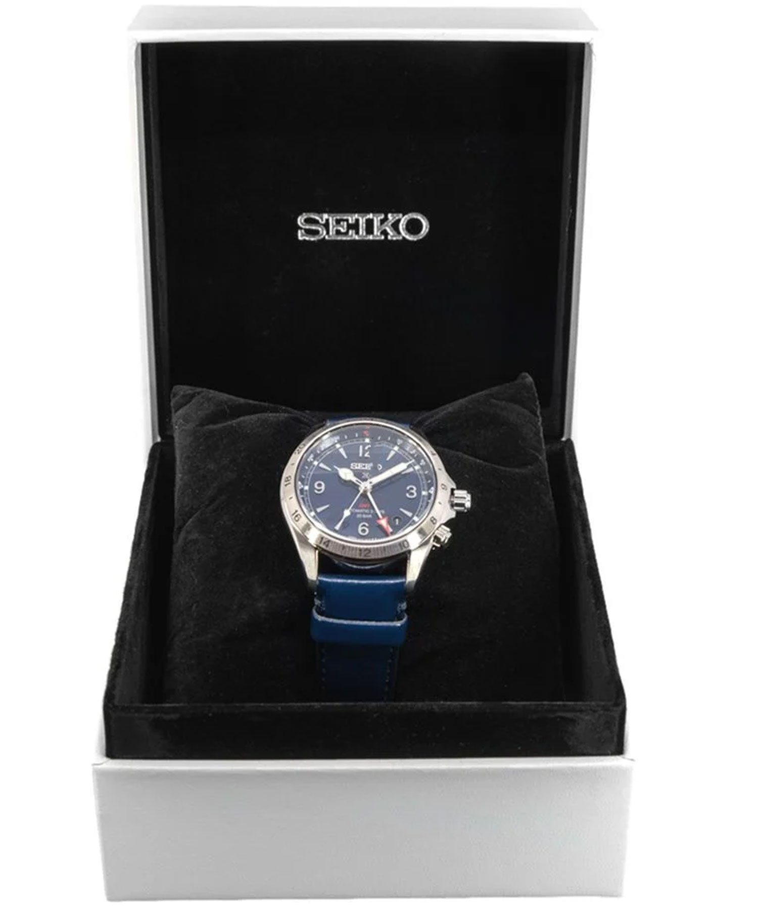 اولین چیزی که در ساعت سیکو SPB377J1 جلب توجه میکند، صفحه نمایش سرمهای (آبی عمیق) با بافت ظریف و عقربههای کلاسیک است. این مدل که به عنوان نسخه GMT آلپینیست شناخته میشود، دارای قاب استیل ضد زنگ با پوشش سخت (Super Hard Coating) است که مقاومت بالایی در برابر خط و خش دارد. بند چرمی آبی رنگ با قفل کلیپسی، هماهنگی بینظیری با صفحه ساعت داشته و راحتی فوقالعادهای را روی دست ایجاد میکند.