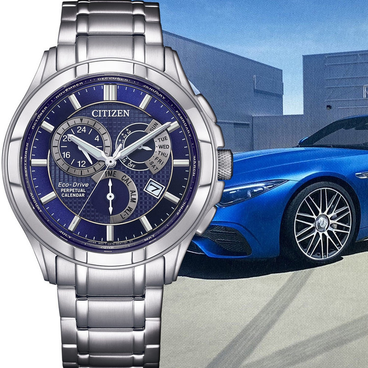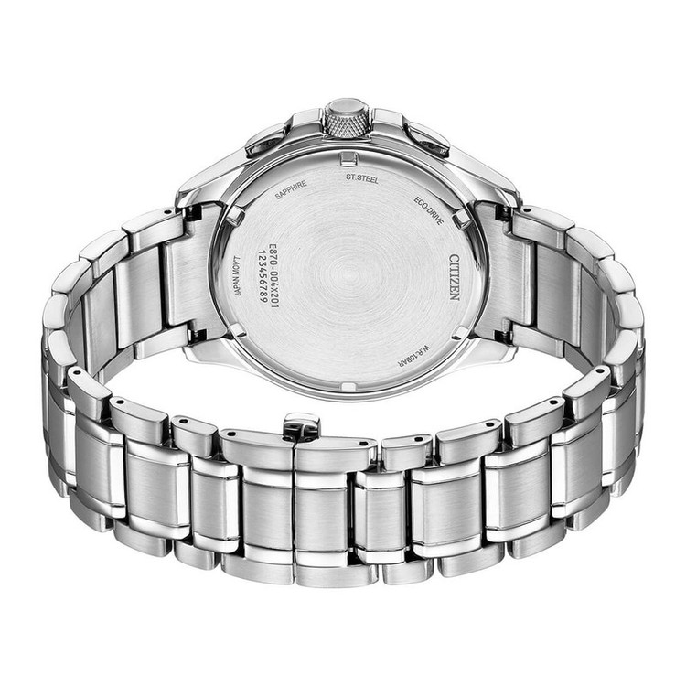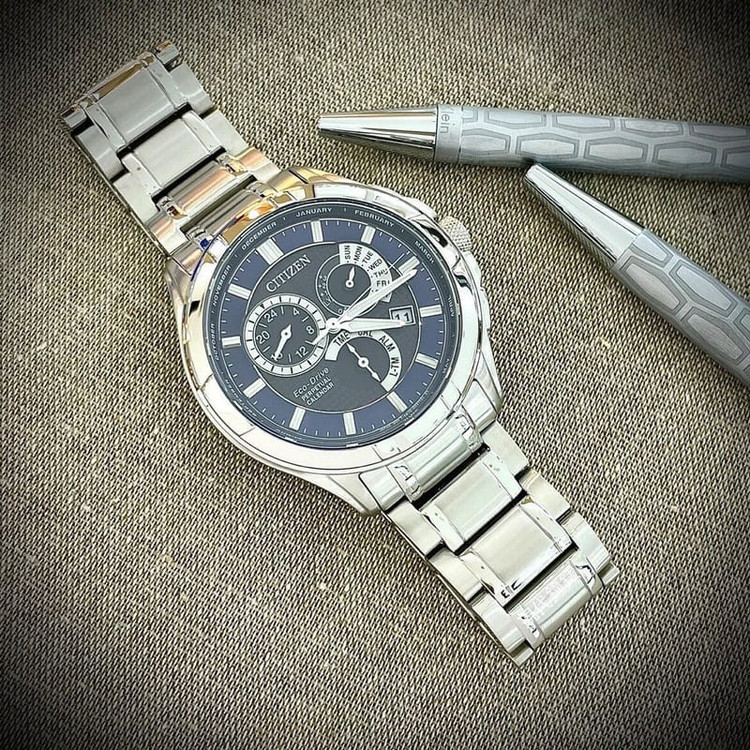 این طرح از ساعت مچی های مردانه برند سیتیزن از طرح های کلاسیک و مجلسی اکودرایو این برند می باشد و قابلیت شارژ با نور را دارد و از طراحی خاص و منحصر به فردی برخوردار بوده و نیز دارای بند و بدنه استیل با ترکیب رنگهای نقره ای و سرمه ای می باشد. این مدل از ساعت مچی های مردانه سیتیزن کرنوگراف بوده و دارای نمایشگر روزهای هفته و ماه های سال بوده و تقویم بی نهایت و دوزمانه و نمایشگر وضعیت 24ساعته و آلارم و قابلیت ذخیره شارژ باطری تا 18ماه را دارد و با صفحه سرمه ای رنگش توجه خاص پسندان را به خود جلب می کند.