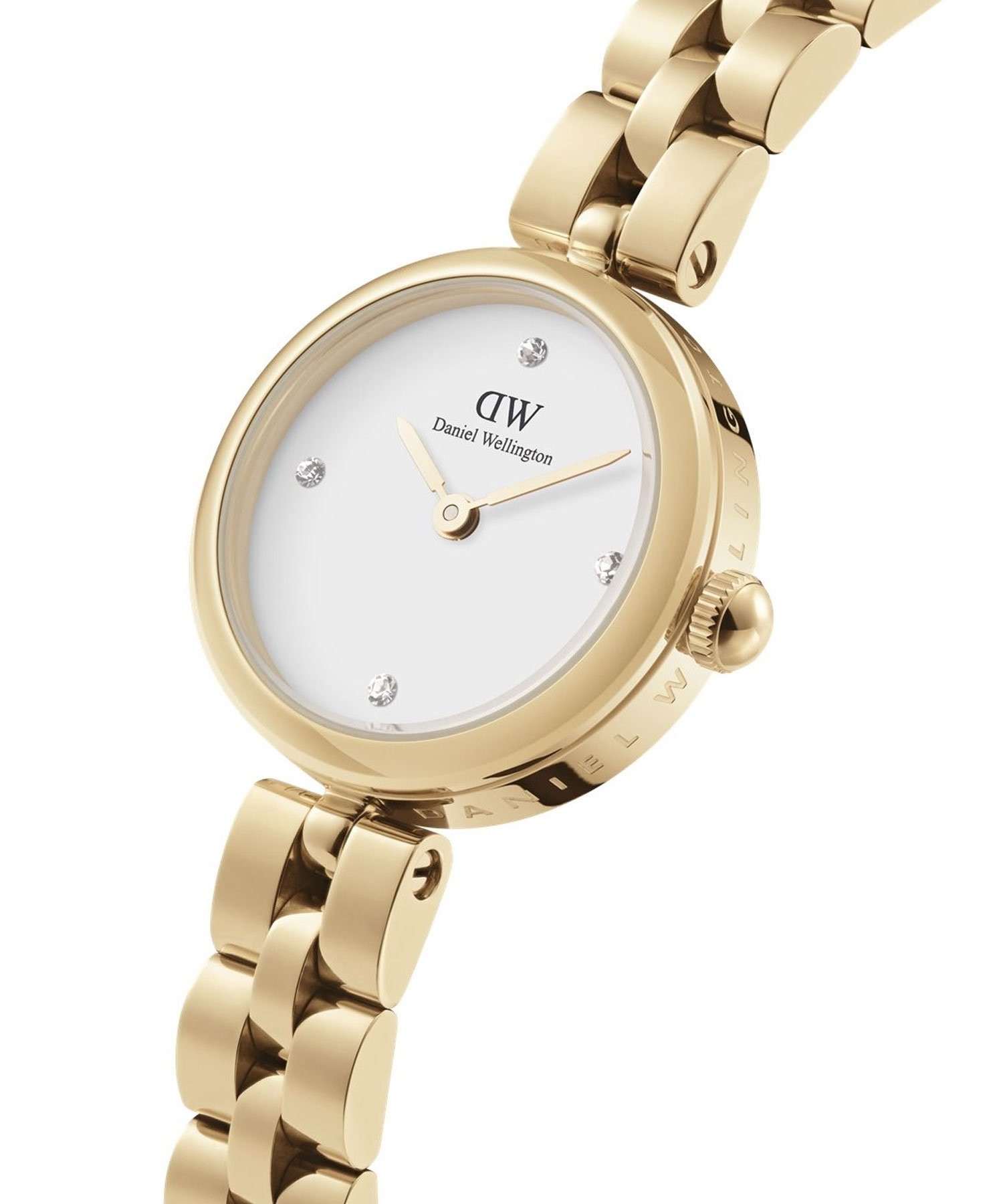 صفحه ساعت بسیار ساده و در عین حال شیک طراحی شده است. لوگوی DW در بالای صفحه قرار دارد و زیر آن نام کامل برند دیده میشود. بهجای اعداد، از نگینهای کوچک برای نشان دادن بعضی از موقعیتهای ساعت استفاده شده که جلوهای مجلل و زنانه به ساعت میدهد.
