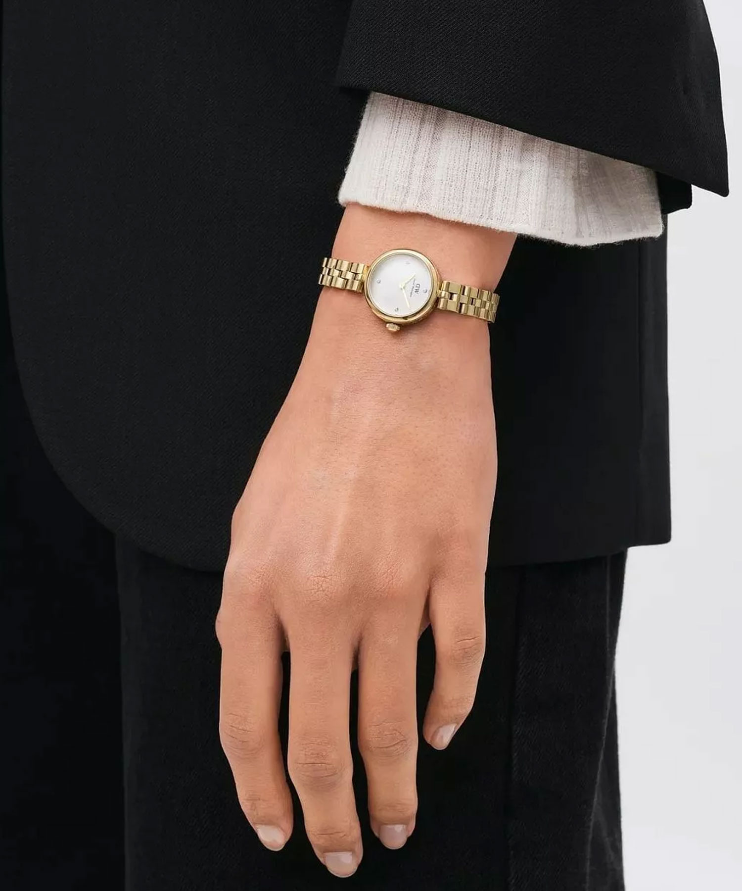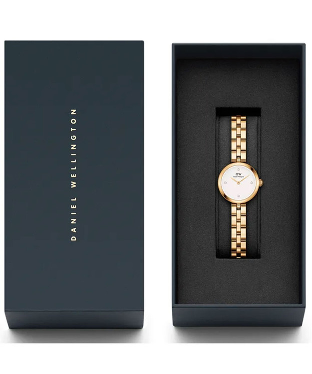 ساعت موجود در تصویر، یک ساعت زنانه با طراحی ظریف و لوکس است که امضای اصلی برند دنیل ولینگتون یعنی سادگی، هماهنگی و زیبایی کلاسیک را به خوبی نشان میدهد. ترکیب بدنه طلایی با صفحه سفید باعث شده این مدل بسیار شیک، تمیز و چشمنواز به نظر برسد.