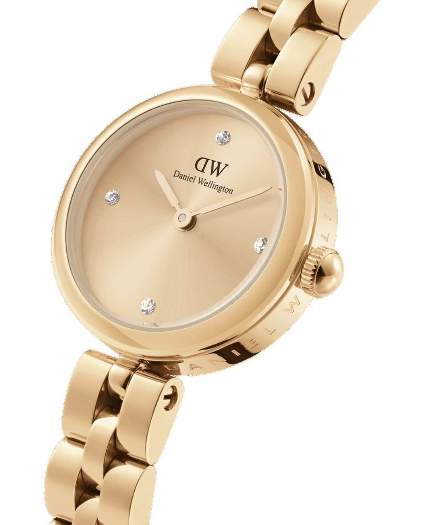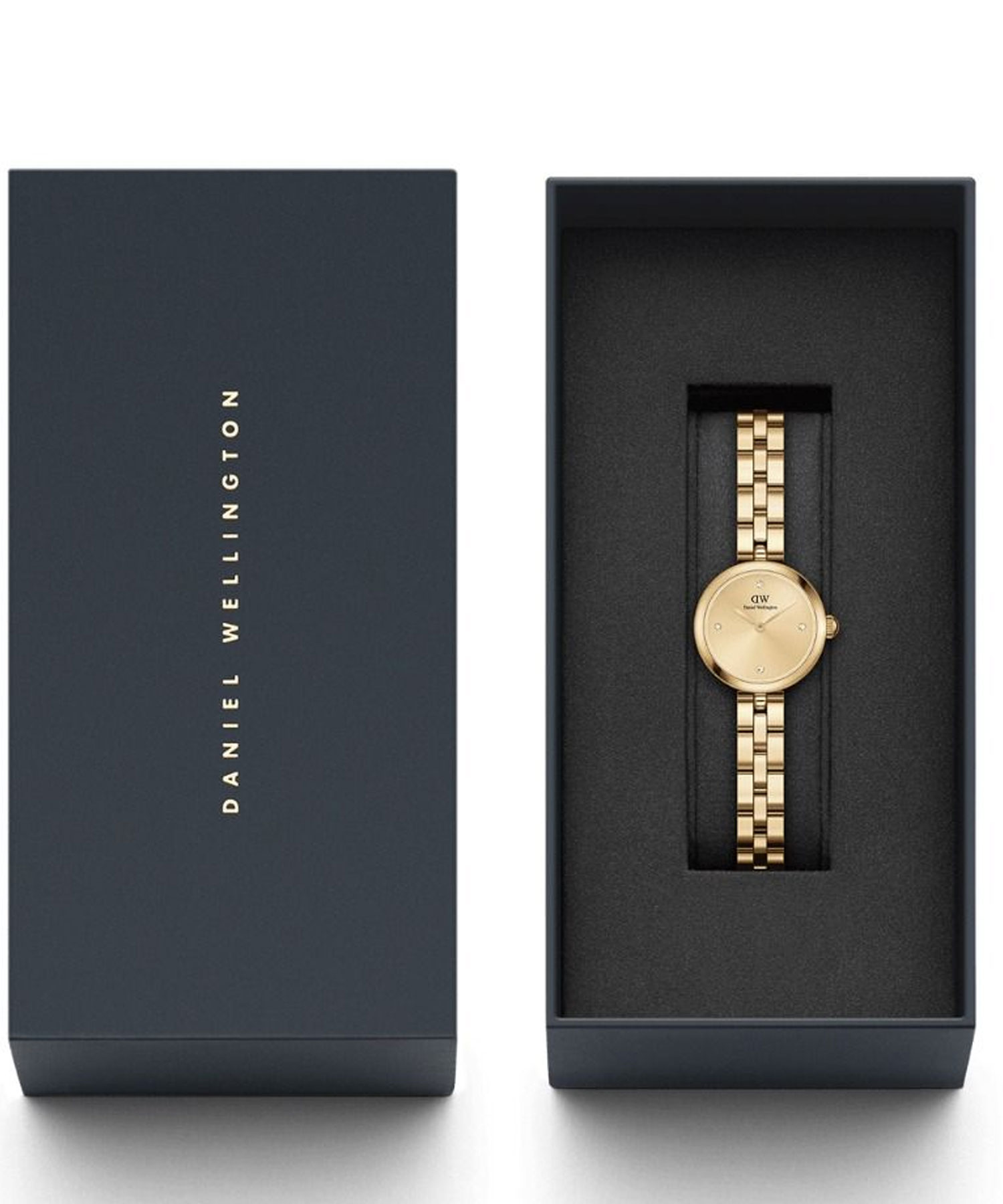 ساعت دنیل ولینگتون موجود در تصویر، یک ساعت زنانه با طراحی مینیمال و لوکس است که با بدنه و بند طلایی، صفحه ساده و نگینهای ظریف، جلوهای بسیار خاص و شیک دارد. این ساعت بیش از آنکه یک ابزار زمانسنجی باشد، یک اکسسوری مد و استایل محسوب میشود.