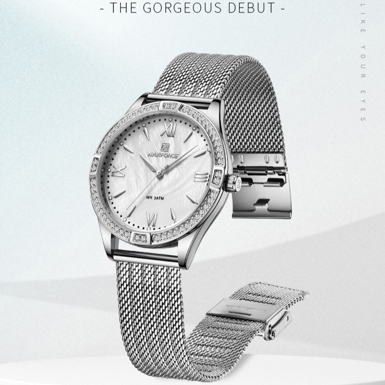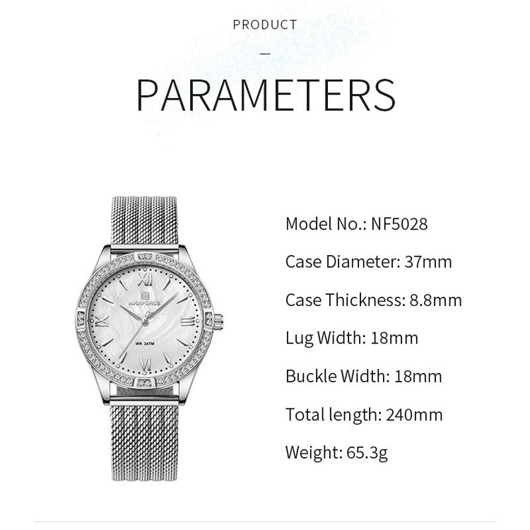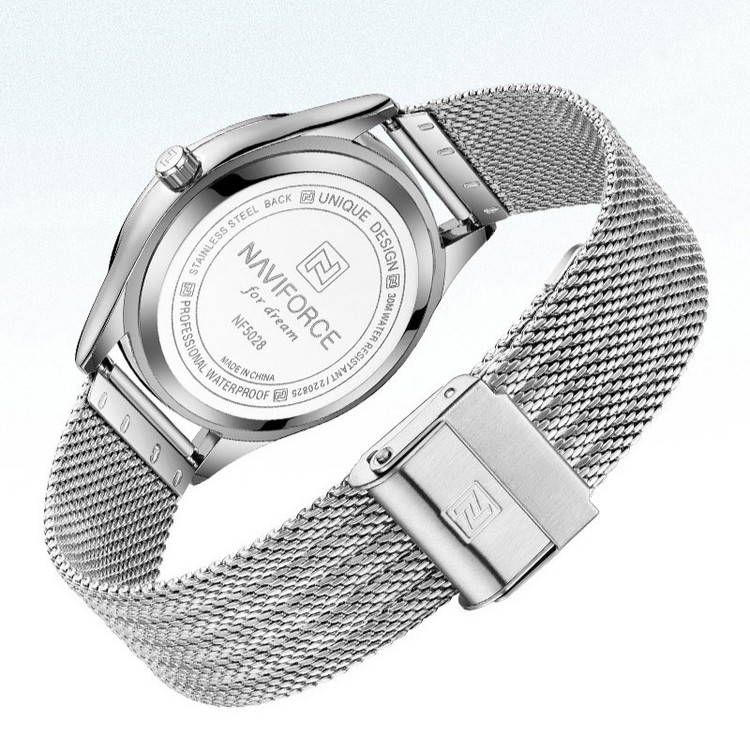 نیوی فورسNF5028Naviforceیکی از جدیدترین مدل کمپانی ناوی فورس است که در یک ماه اخیر تولید و روانه بازار جهانی شده است . این مدل مثل بقیه تولیدات این شرکت بزرگ و معروف از کیفیت بسیار بالای برخوردار بوده و از یک موتور ژاپن درجه یک ساخته شده و همچنین دارای قاب فول استیل تو پر و سنگین بوده و تا عمق 3 متری ضدآب است که میتوانید این ساعت زنانه اوریجینال را همیشه در دستان زیبای خود داشته باشید . کالا اصلی و شرکتی می باشد و موتور آن کوارتز ساخت ژاپن با کیفیت درجه یک است بند و بدنه فول استیل رنگ ثابت و ضد حساسیت است وشیشه ساعت کریستالی مقاوم در برابرخط وخش و ضد آب تا 3 متر است