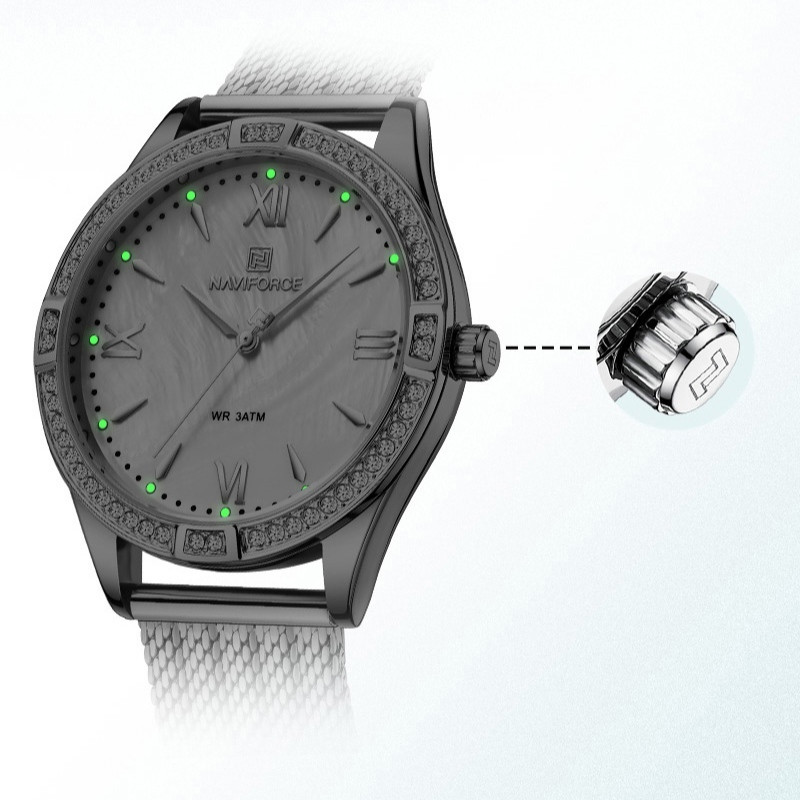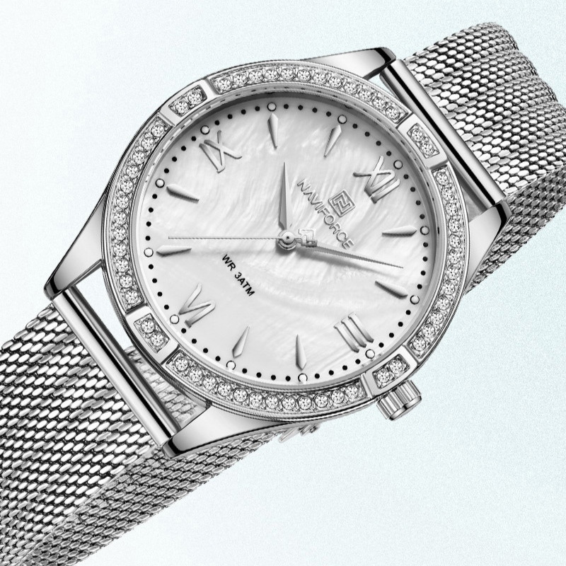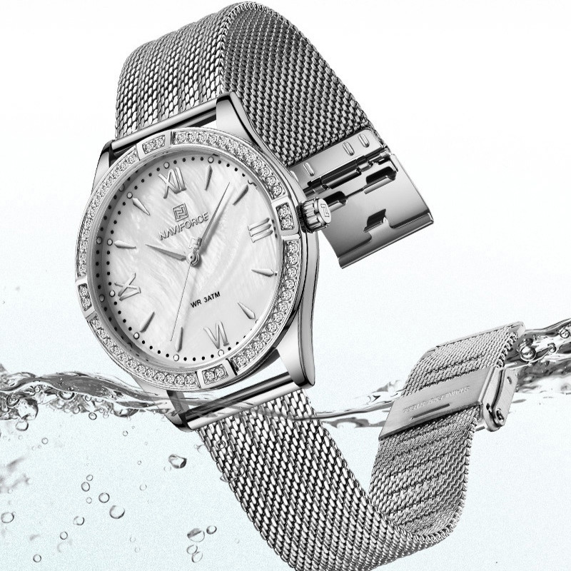 نیوی فورسNF5028Naviforceیکی از جدیدترین مدل کمپانی ناوی فورس است که در یک ماه اخیر تولید و روانه بازار جهانی شده است . این مدل مثل بقیه تولیدات این شرکت بزرگ و معروف از کیفیت بسیار بالای برخوردار بوده و از یک موتور ژاپن درجه یک ساخته شده و همچنین دارای قاب فول استیل تو پر و سنگین بوده و تا عمق 3 متری ضدآب است که میتوانید این ساعت زنانه اوریجینال را همیشه در دستان زیبای خود داشته باشید . کالا اصلی و شرکتی می باشد و موتور آن کوارتز ساخت ژاپن با کیفیت درجه یک است بند و بدنه فول استیل رنگ ثابت و ضد حساسیت است وشیشه ساعت کریستالی مقاوم در برابرخط وخش و ضد آب تا 3 متر است