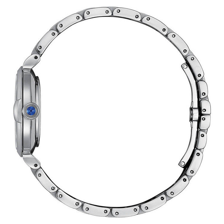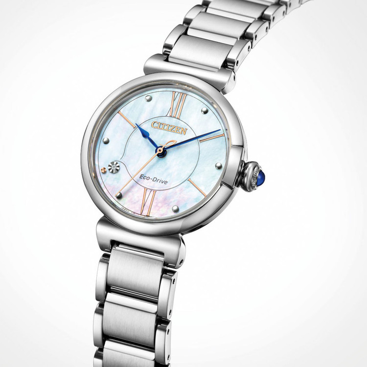ساعت مچی بند استیل نقره ای، صفحه سفید صدفی دور نقره ای زنانه سیتی زن - اکودرایو ( ذخیره 6 ماه ) - برلیان دار - شیشه ضدخش - ضد آب ( تا 50 متر )