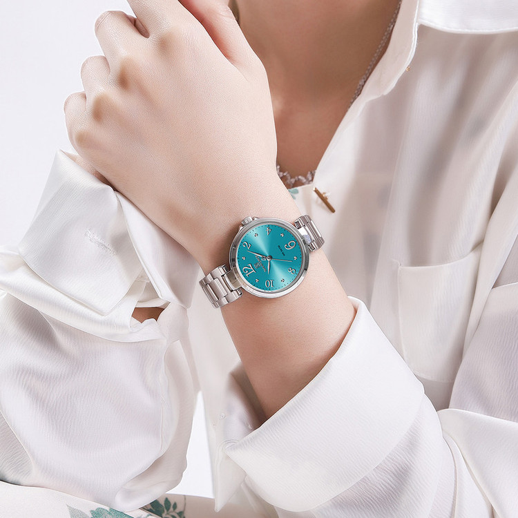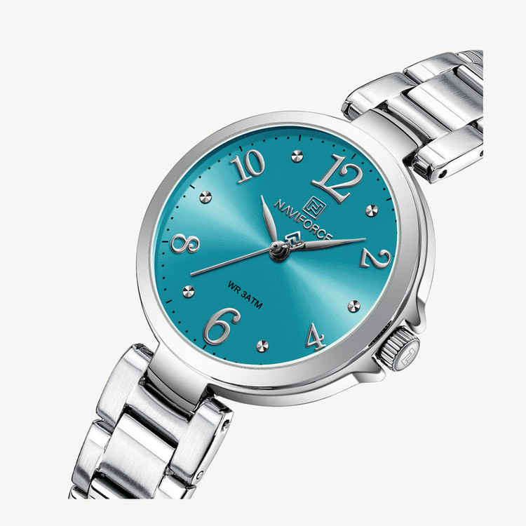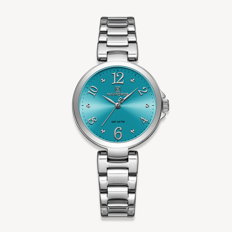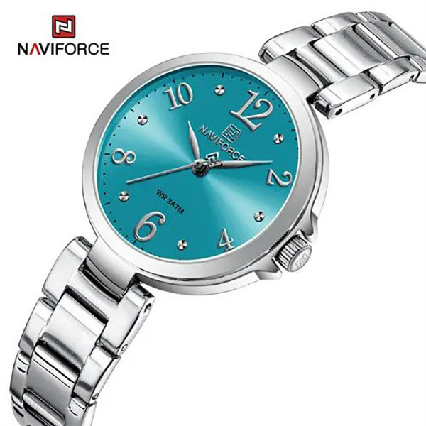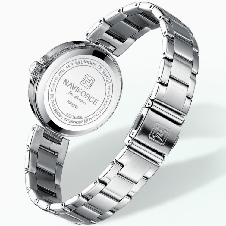 ساعت مچی عقربه ای زنانه نیوی فورس مدل NF 5031 جدیدترین سری نیوی فورس دارای موتور قدرتمند کوارتز ساخت شرکت اپسون ژاپن میباشد. این نوع محصول نیروی مورد نیاز خود را از طریق یک باتری تامین میکنند. این مدل ساعتها در اندازهگیری زمان بسیار دقیق و قابل اعتماد است.این ساعت دارای جنس بدنه و بند استیل ضخیم بوده به رنگ نقره ای و قفل آن مدل کلیپسی ضامندار استیل با حک برند نیوی فورس میباشد.جنس شیشه این ساعت معدنی تقویت شده و محکم مقاوم در برابر خراش است.حک برند و لوگوی نیوی فورس برروی صفحه،قفل،سرکوک و پشت درب ساعت.دارای هولوگرام تایید کیفیت بر روی درب. قابل استفاده برای بانوان. طراحی ضد آب: مناسب برای شستن دست، در هوای شرجی و بارانی و پاشیدن آب به ساعت . این ساعت عقربهای زنانه دارای ظاهری شیک و جذاب بوده و برای استفاده در شرایط رسمی و نیمهرسمی کاملا مناسب خواهد بود.