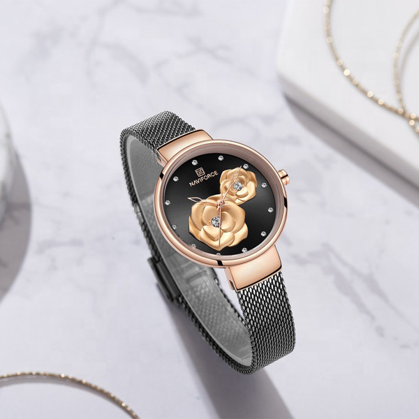 ساعت مچی زنانه نیوی فورس NAVIFORCE مدل NF5013 می باشد. کسانی که ساعت مچی اورجینال با قیمت مناسب و با دوام و کیفیت بالا می خواهند NAVIFORCE یک انتخاب عالی محسوب می شود. این ساعت با طراحی کلاسیک ، بند استیل حصیری میباشد. ساعت های نیوی فورس محصول اورجینال هستند که موتور کوارتز ساخت ژاپن با کیفیت عالی دارند. دارای بند ضد حساسیت و رنگ ثابت با شیشه معدنی مقاوم در برابر خش که در این چند سال خیلی توانسته در دل مردم جا باز کند. ساعت های نیوی فورس ظاهر جذاب و اسپرتی دارند.