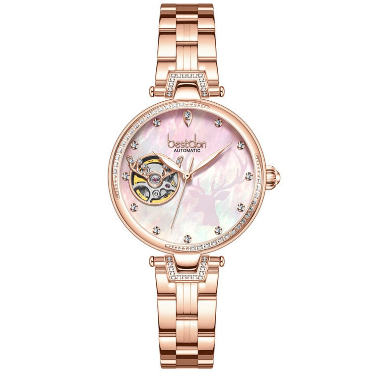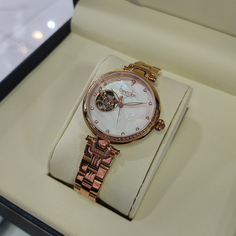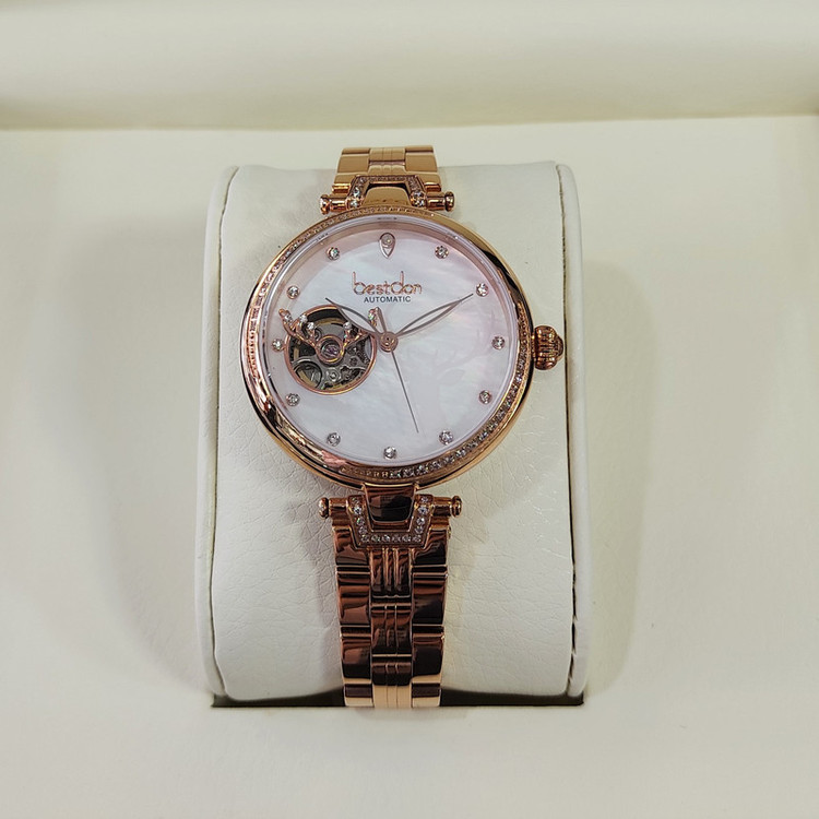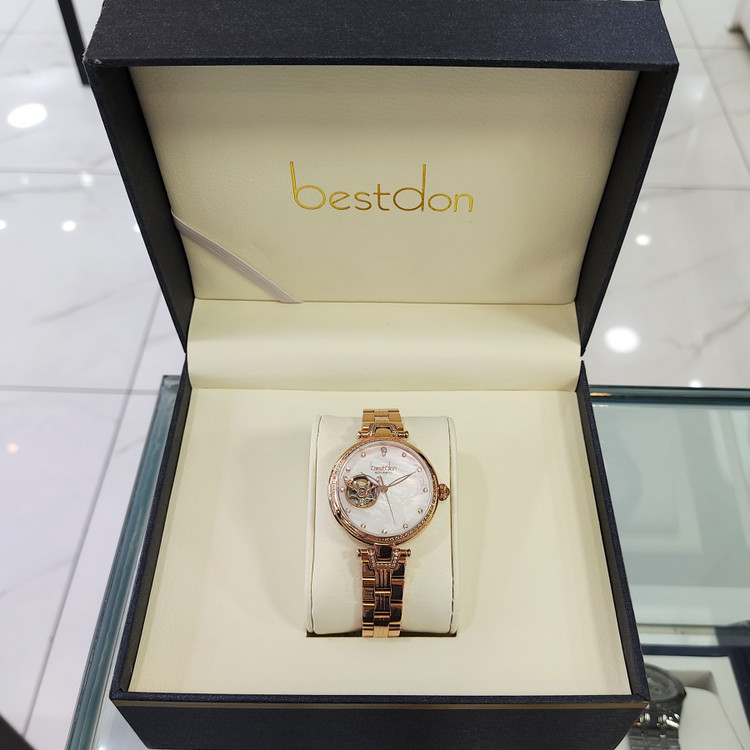 این ساعت مچی از برند بستدون زنانه بوده و جنس بند و بدنه ی آن استیل آنتی آلرژی و ضد حساسیت می باشد که از رنگ رزگلد در آن استفاده شده است. سادگی در ساعت های بستدون کاملا مشهود است و به شکلی زیبا از این سادگی در ساعتهای بستدون استفاده شده که چشم هر بیننده ای را به خود جلب میکنند و زیبایی صفحه ی این ساعت مثال زدنی میباشد.این ساعت اتوماتیک و کوکی بوده و نیاز به باطری ندارد.