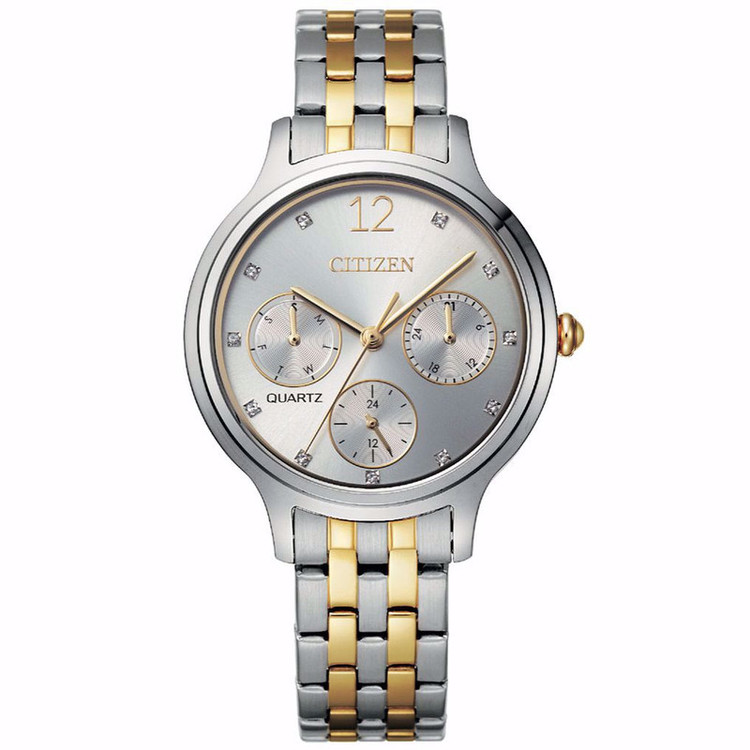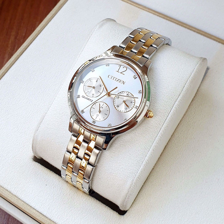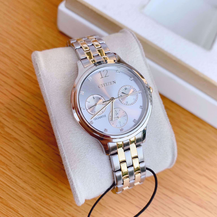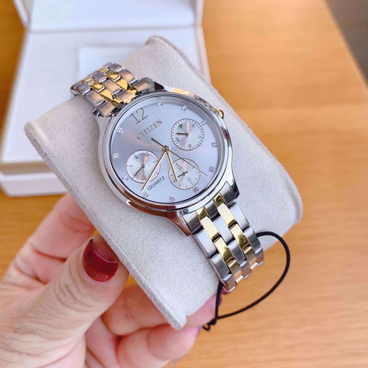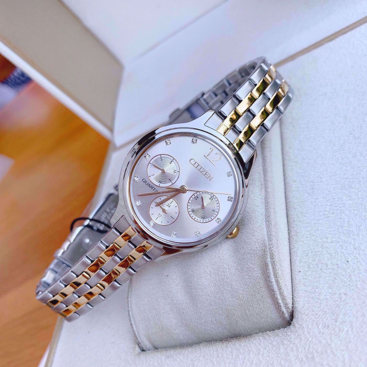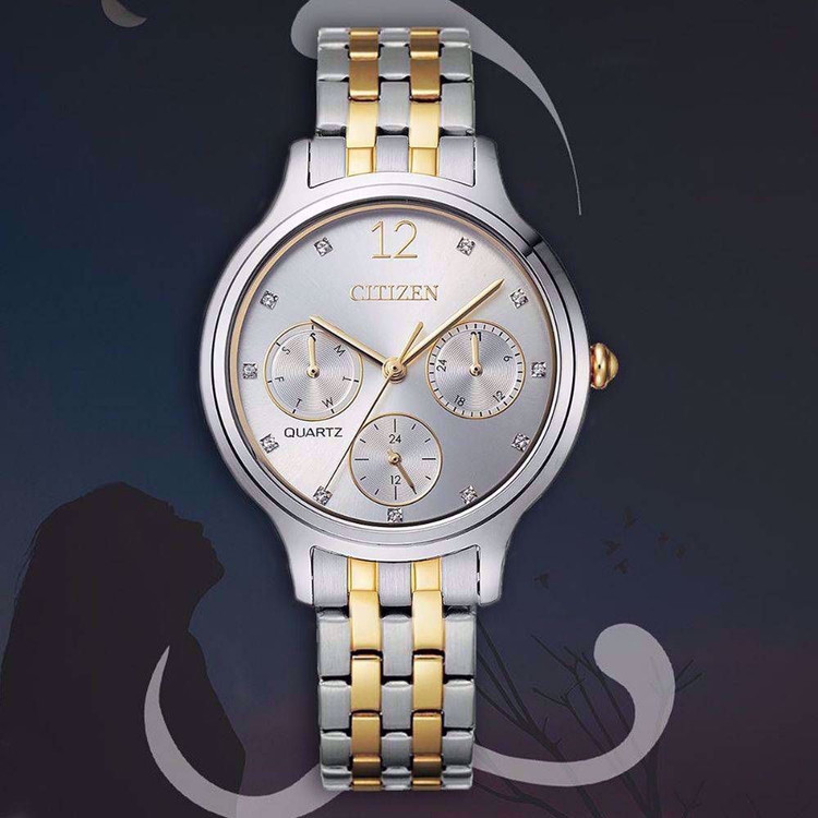 این طرح از ساعت مچی های زنانه برند سیتیزن هم مناسب ست کلاسیک و مجلسی و هم مناسب تیپ اسپرت می باشد ونیز از ظرافت خاص و منحصر به فردی برخوردار است. این مدل از ساعت های برند سیتیزن جزو ساعت های پرفروش این برند می باشد و دارای بند و بدنه استیل نقره ای طلایی بوده و در عین ظرافت صاحب جذابیت و ابهت بی نظیری است. این ساعت فول دیت بوده و دارای نمایشگر روزهای ماه و هفته و وضعیت 24 ساعته می باشد .