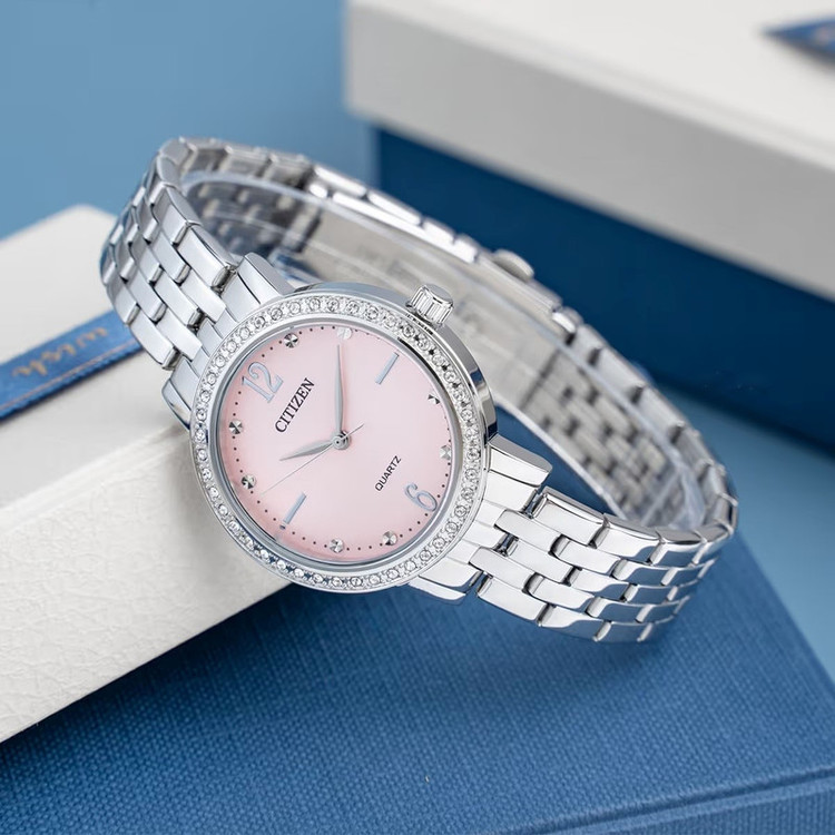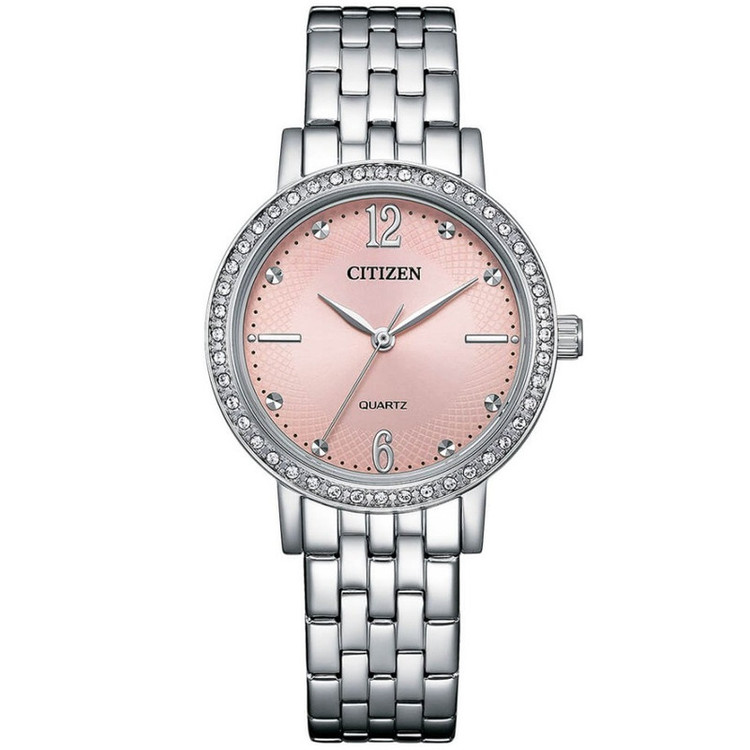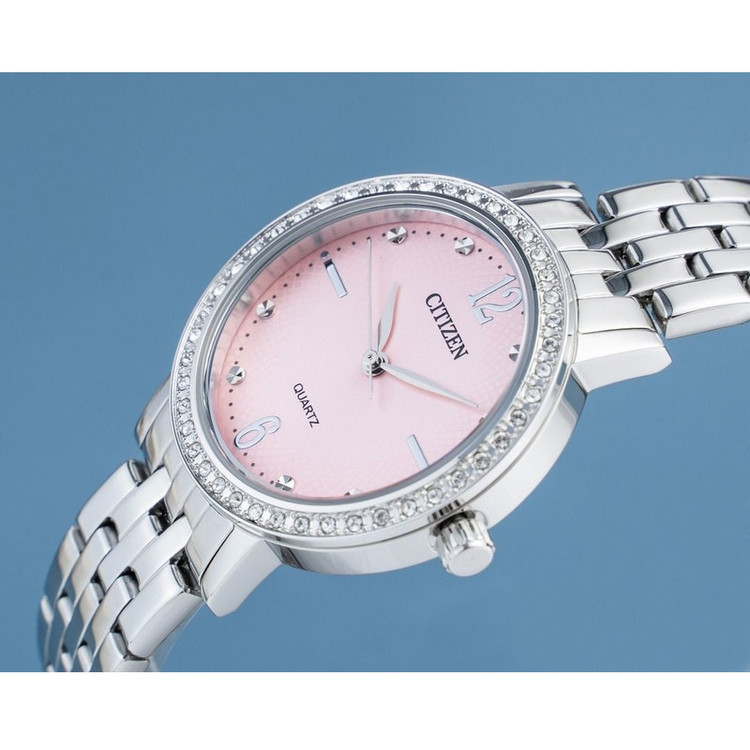 این مدل از ساعت مچی های زنانه برند سیتیزن مختص تیپ مجلسی و کلاسیک طراحی شده و دارای بدنه و بند استیل نقره ای و صفحه صورتی می باشد. این طرح از ساعت های برند سیتیزن از ساعت های پرفروش و محبوب این برند محسوب می شوند.