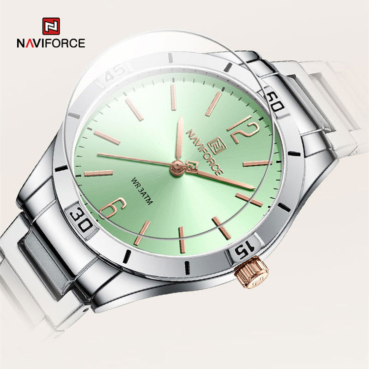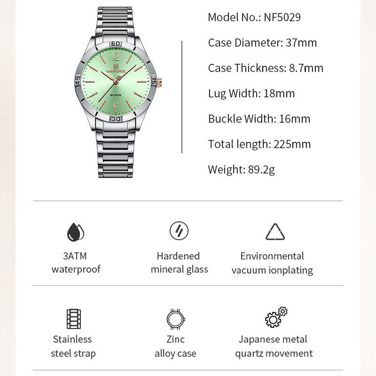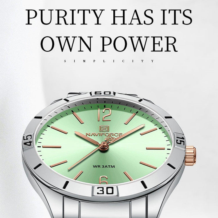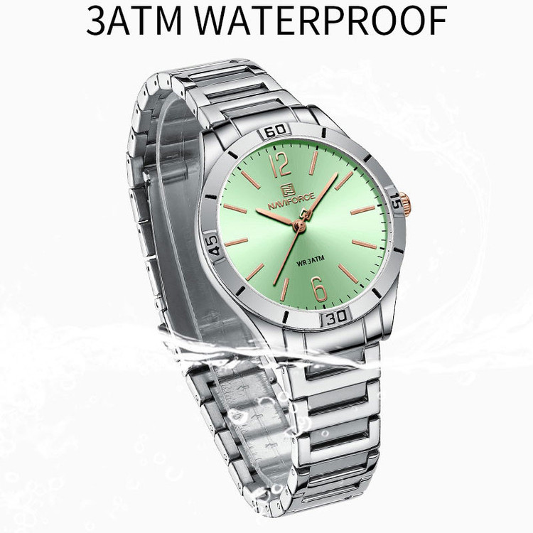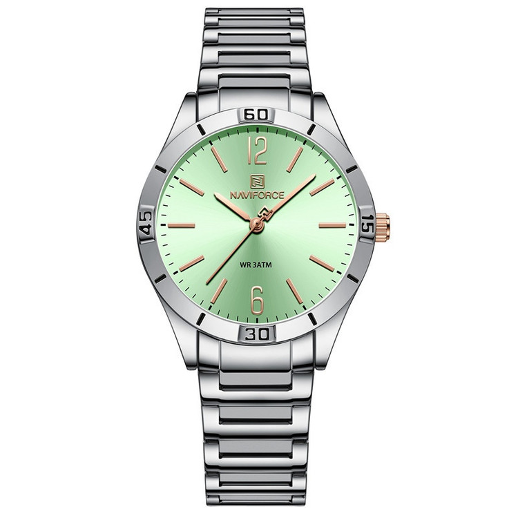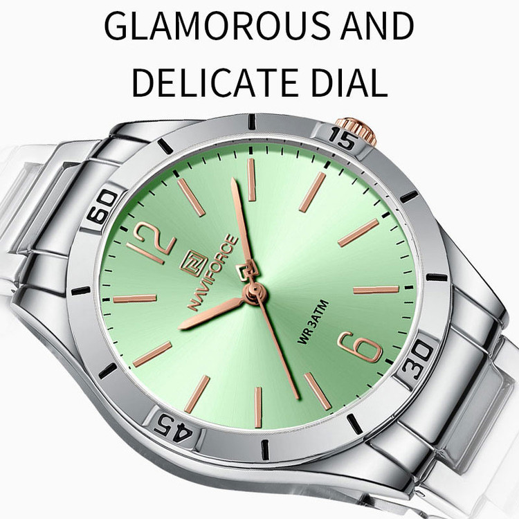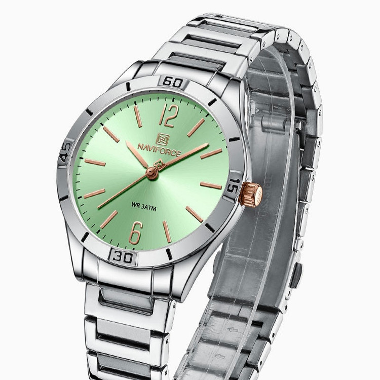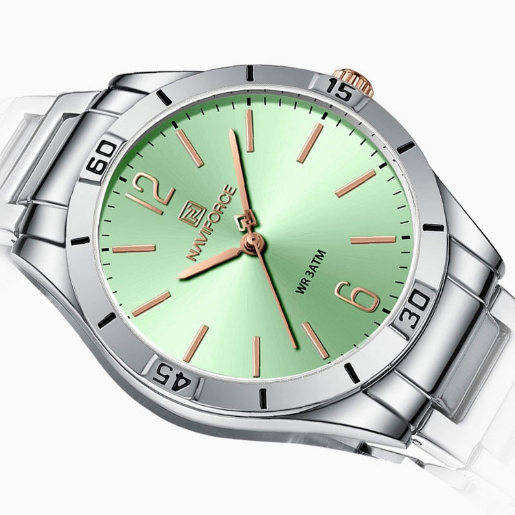 از پرطرفدارترین اکسسوریهای مردانه و زنانه، ساعتهای مچی هستند که در انواع مختلف عقربهای و دیجیتال در بازار عرضه میشوند. معمولا ساعتهای مچی دارای تاریخشمار روز، ماه و سال نیز هستند که در دو نوع مکانیکی و کوارتز وجود دارند. ساعت مچی عقربه ای زنانه نیوی فورس مدل NF5029دارای موتور کوارتز بوده، این نوع محصول نیروی مورد نیاز خود را از طریق یک باتری تامین میکنند. این مدل ساعتها در اندازهگیری زمان بسیار دقیق و قابل اعتماد بوده و درصد خطای آنها کمتر از انواع دیگر است. ساعت مچی عقربه ای زنانه نیوی فورس مدل NF5029 دارای مقاومت در برابر آب 3 متر است، این ساعت دارای جنس بدنه استیل نقره ای رنگ بوده و قابل استفاده برای بانوان است. جنس شیشه این محصول نیز معدنی است. این ساعت عقربهای زنانه دارای ظاهری شیک و جذاب بوده و برای استفاده در شرایط رسمی و نیمهرسمی کاملا مناسب خواهد بود