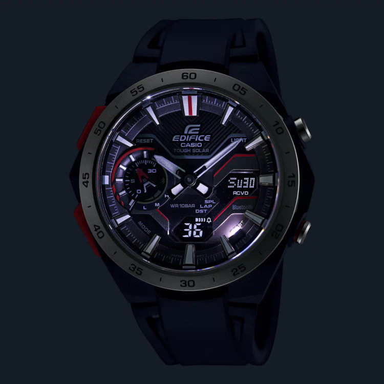 با EDIFICE WINDFLOW ECB-2200P، کرونوگراف ترکیبی دیجیتال-آنالوگ الهامگرفته از پیست مسابقه، میتوان حس شتاب خالص یک خودروی فرمول یک را هنگام درخشش در پیست تجربه کرد. طراحی نمای جانبی که حس عبور باد روی یک خودروی فرمول یک با گلگیرهای قوسدار را تداعی میکند، همراه با صفحه مکانیکی تیز و چندبعدی، جلوهای خاص از سرعت ناب را نمایش میدهد. قاب رزینی تقویتشده با فیبر کربن، استحکام ساعت را افزایش میدهد و در عین حال وزن آن را سبک نگه میدارد تا برای استفاده روزمره مناسب باشد.